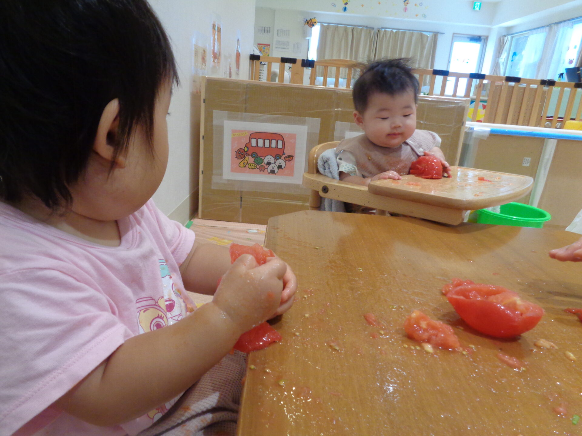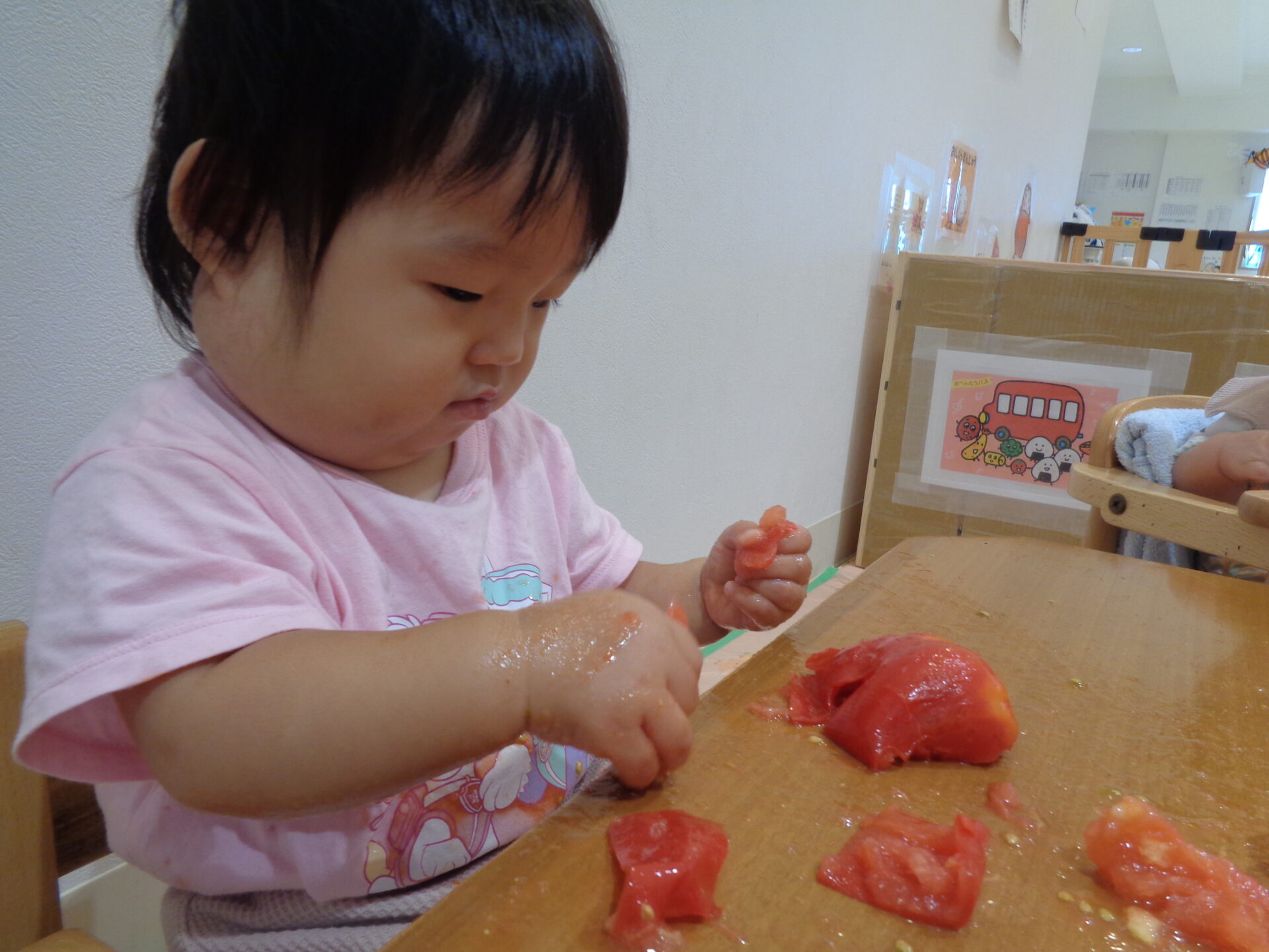 トマトの中身に指を入れて感触の違いを楽しみました。