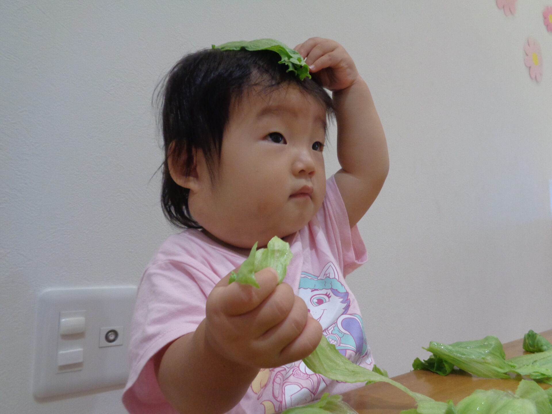 保育士が「こっちのほうが乗せやすいよ」と大きいレタスを渡して