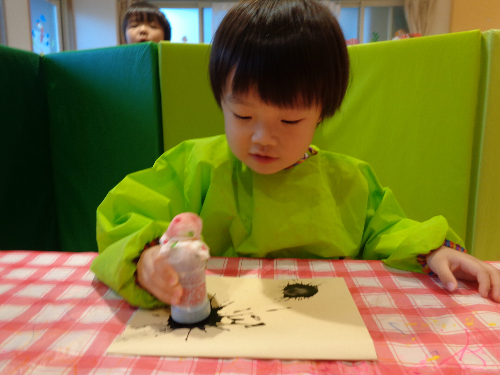 なんと黒い色水を吸わせた綿ボールをダイナミックに叩いて、皆さんもご存じのかわいいあのキャラクターを表現します。