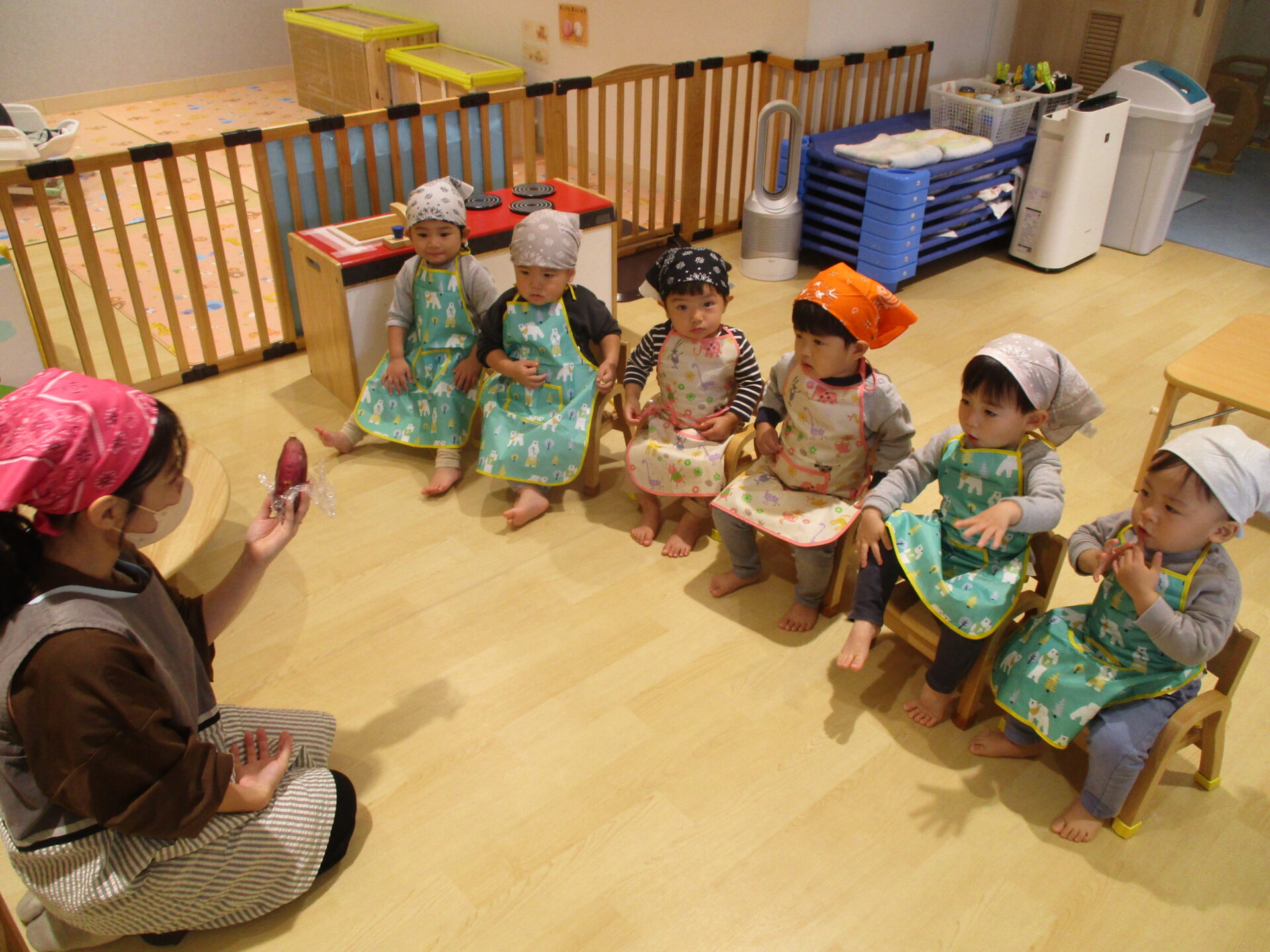と言いながらお芋を持って移動すると、後ろからついてきていた子どもたちも