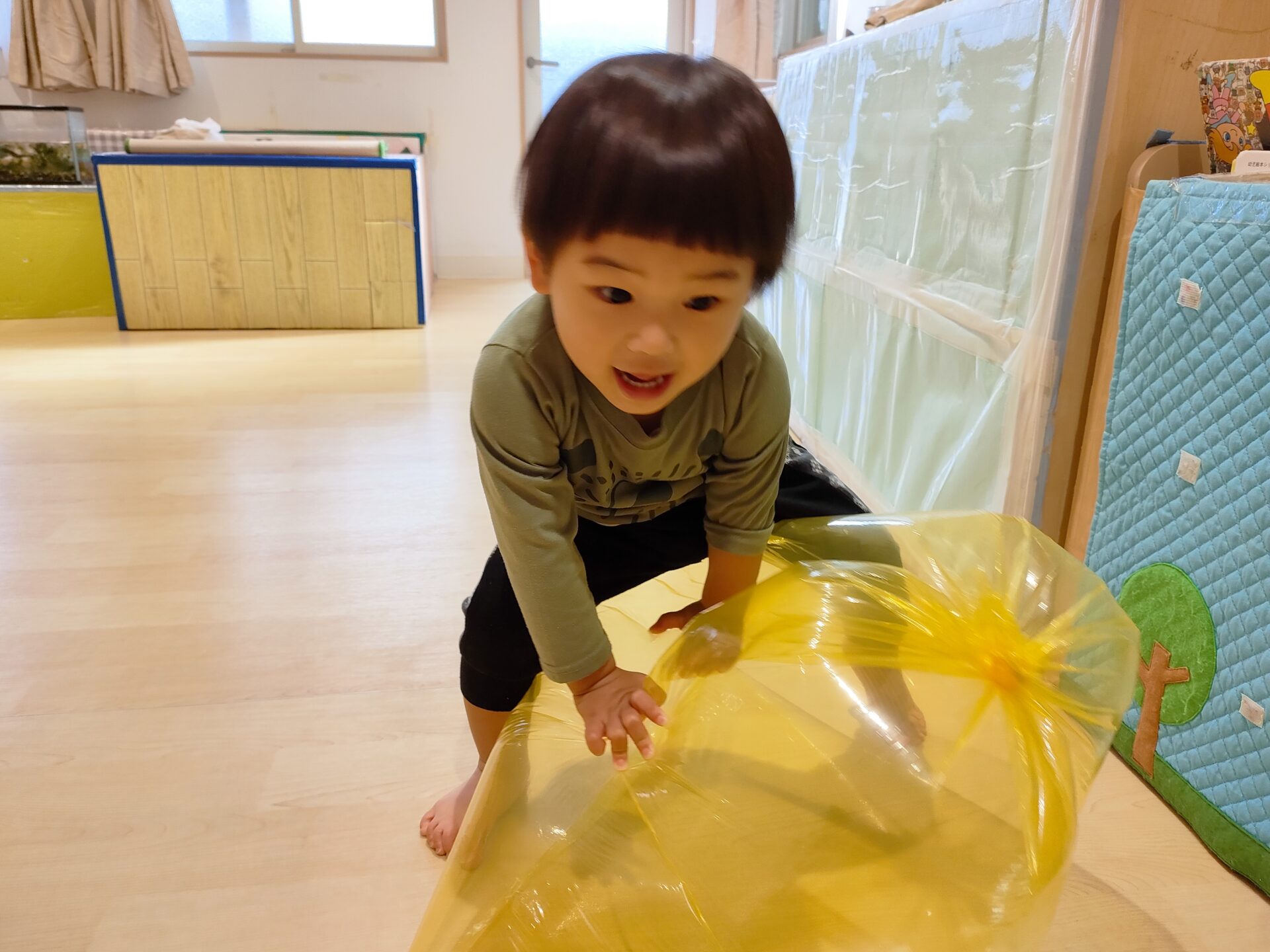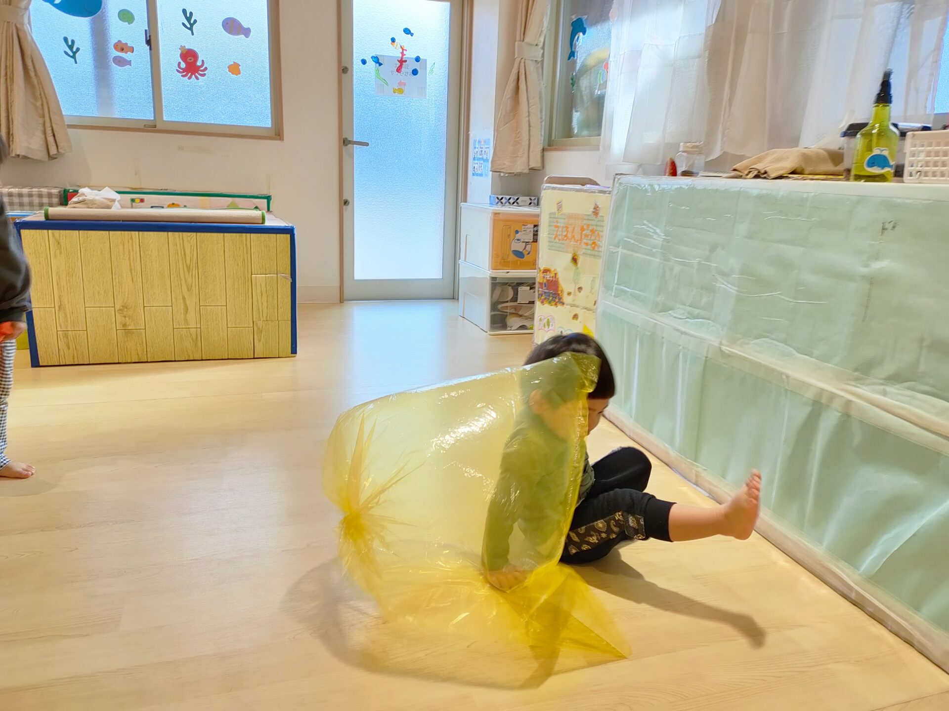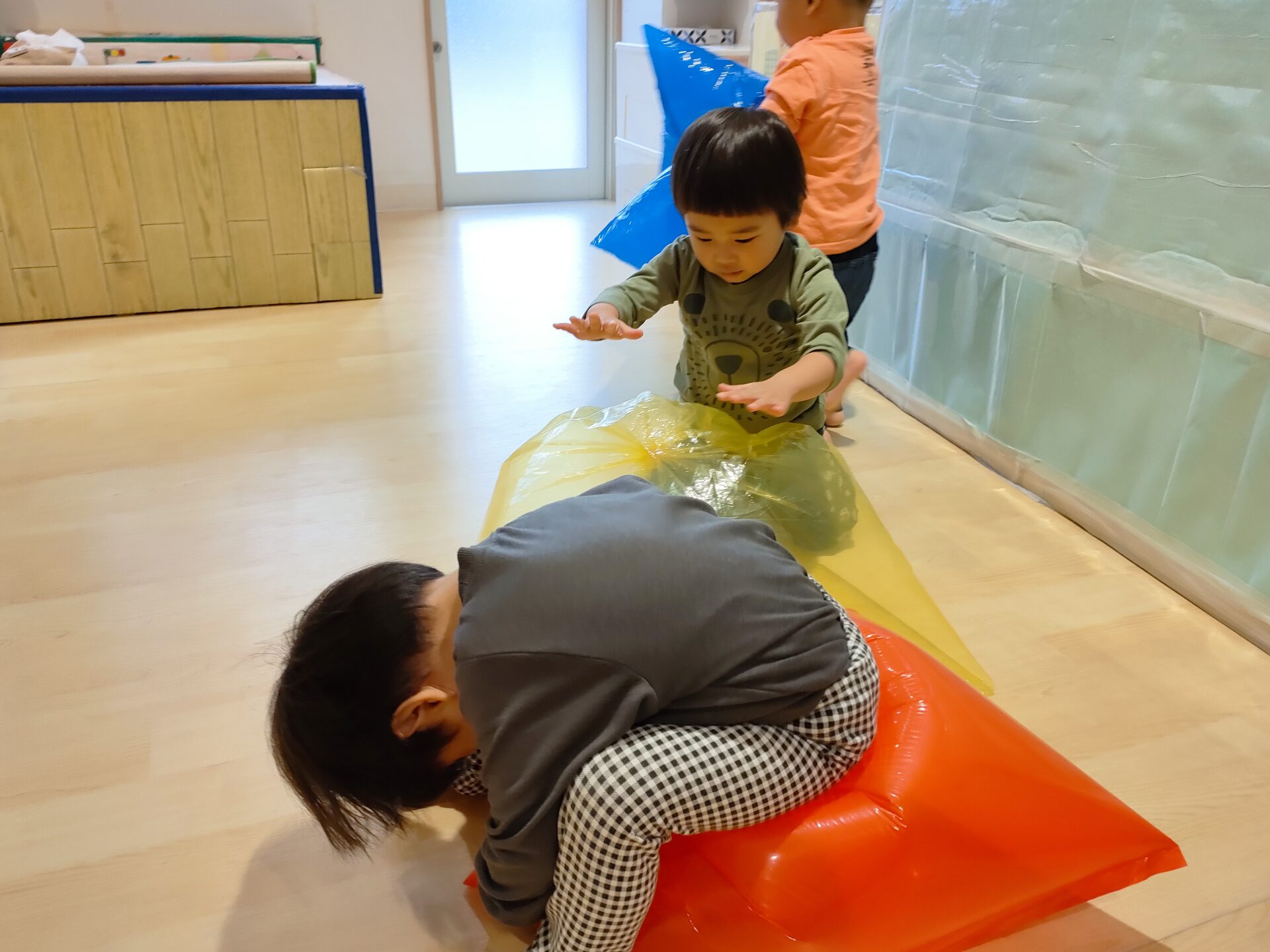 今月は、カラーポリ袋や段ボールを使って室内遊びをしました。