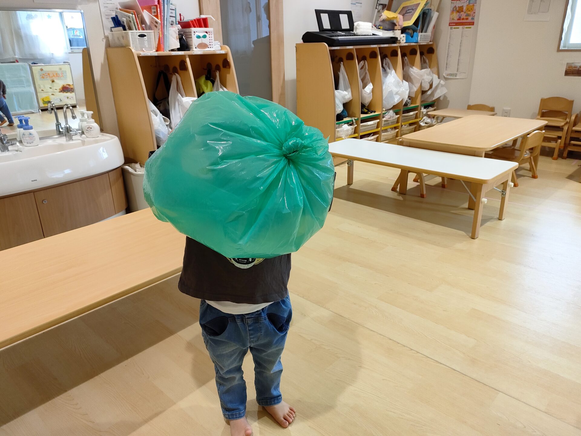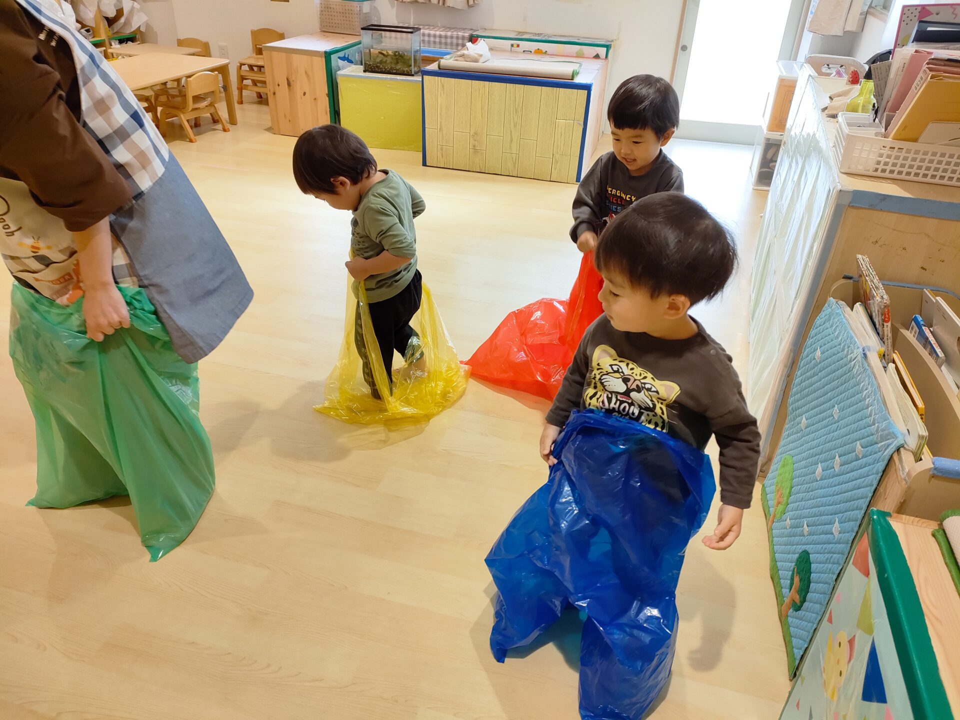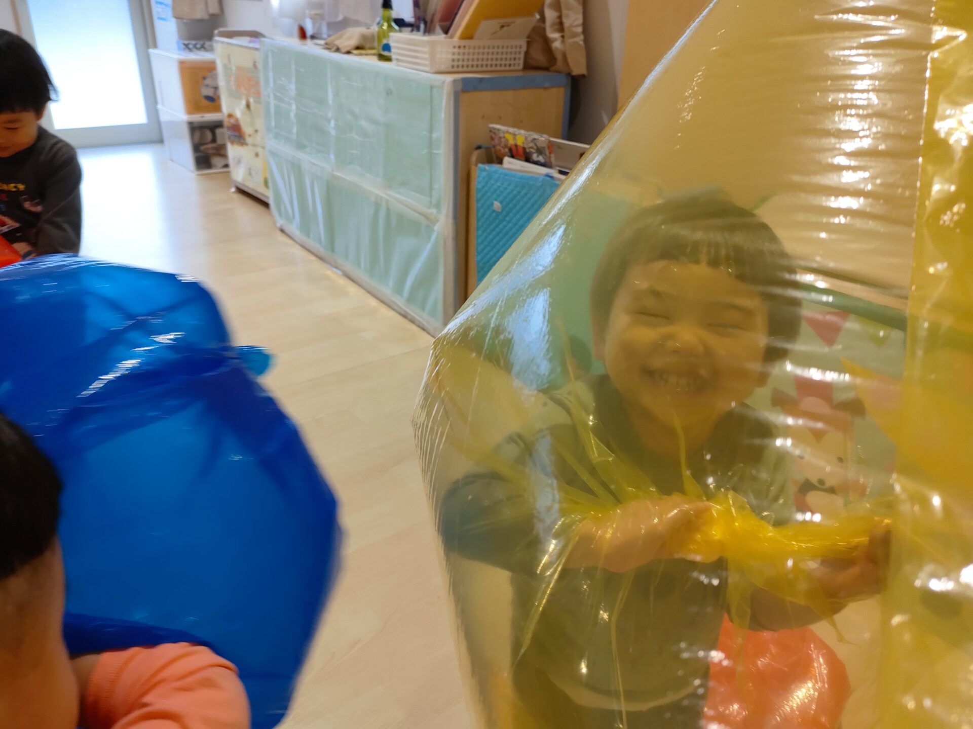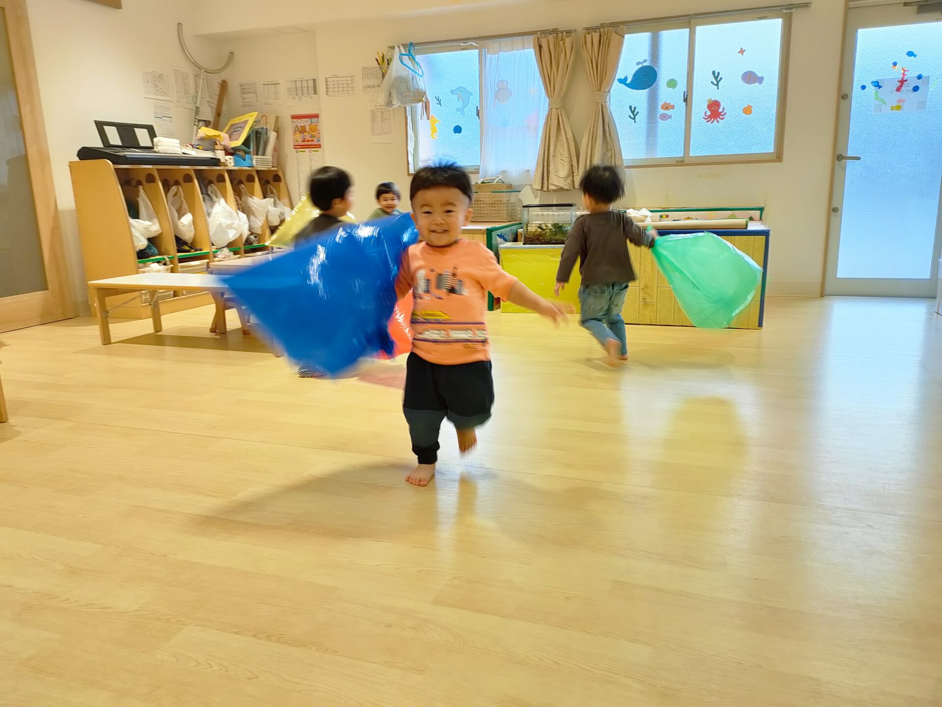 今月は、カラーポリ袋や段ボールを使って室内遊びをしました。