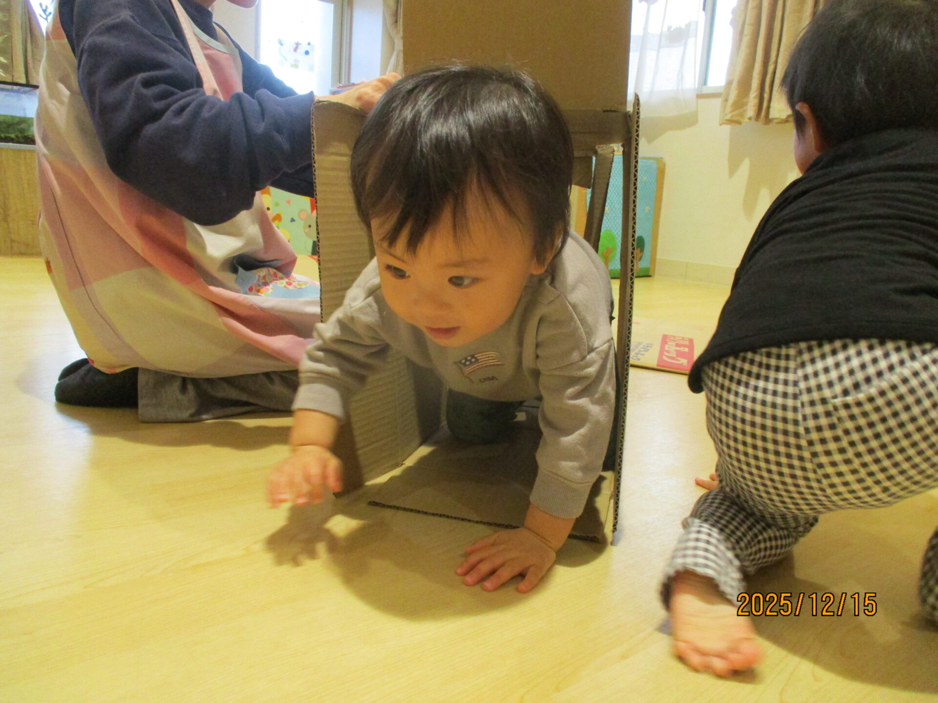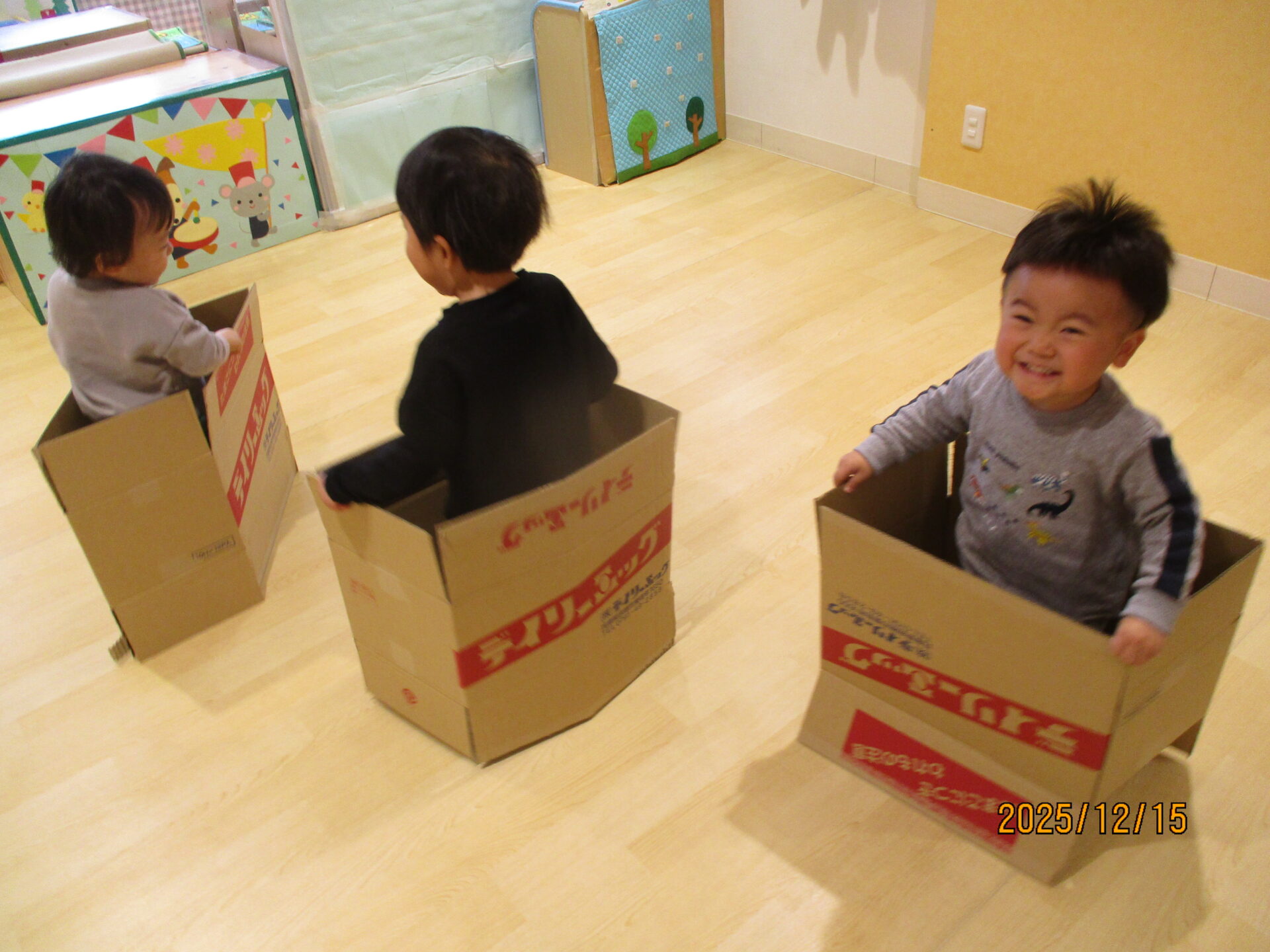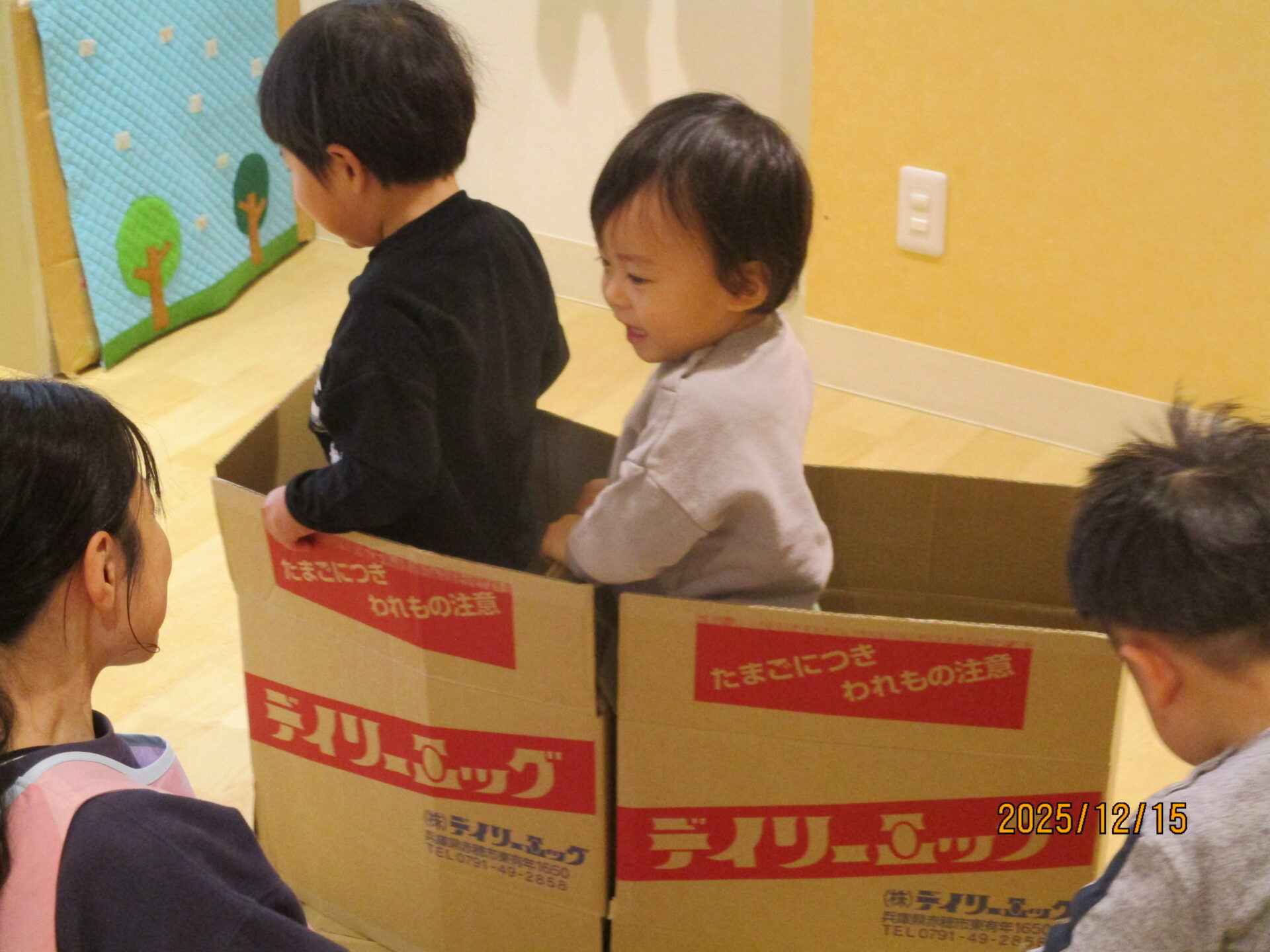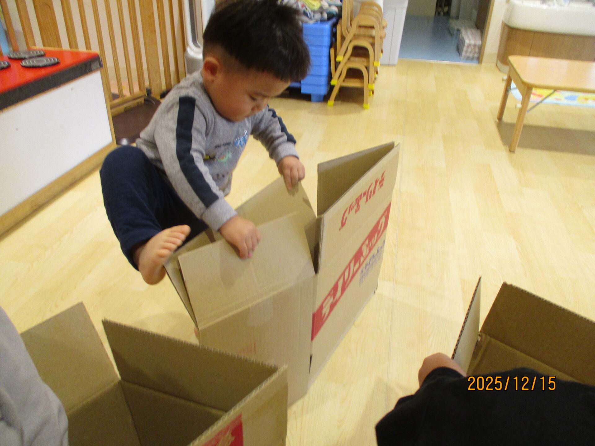 別の日には、段ボールで遊びました。