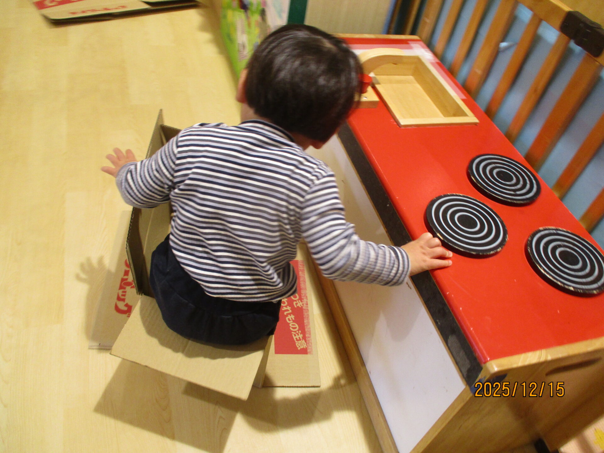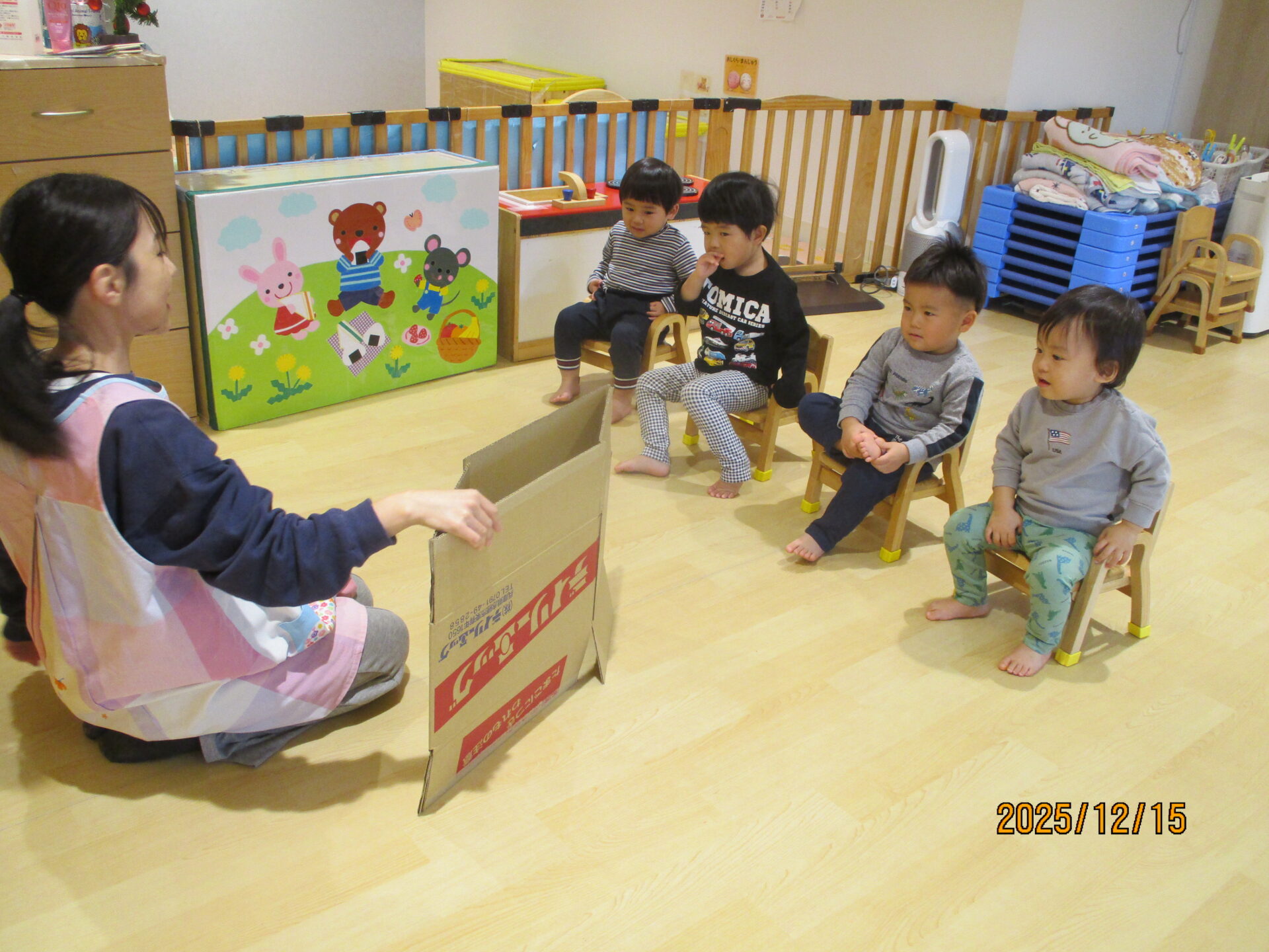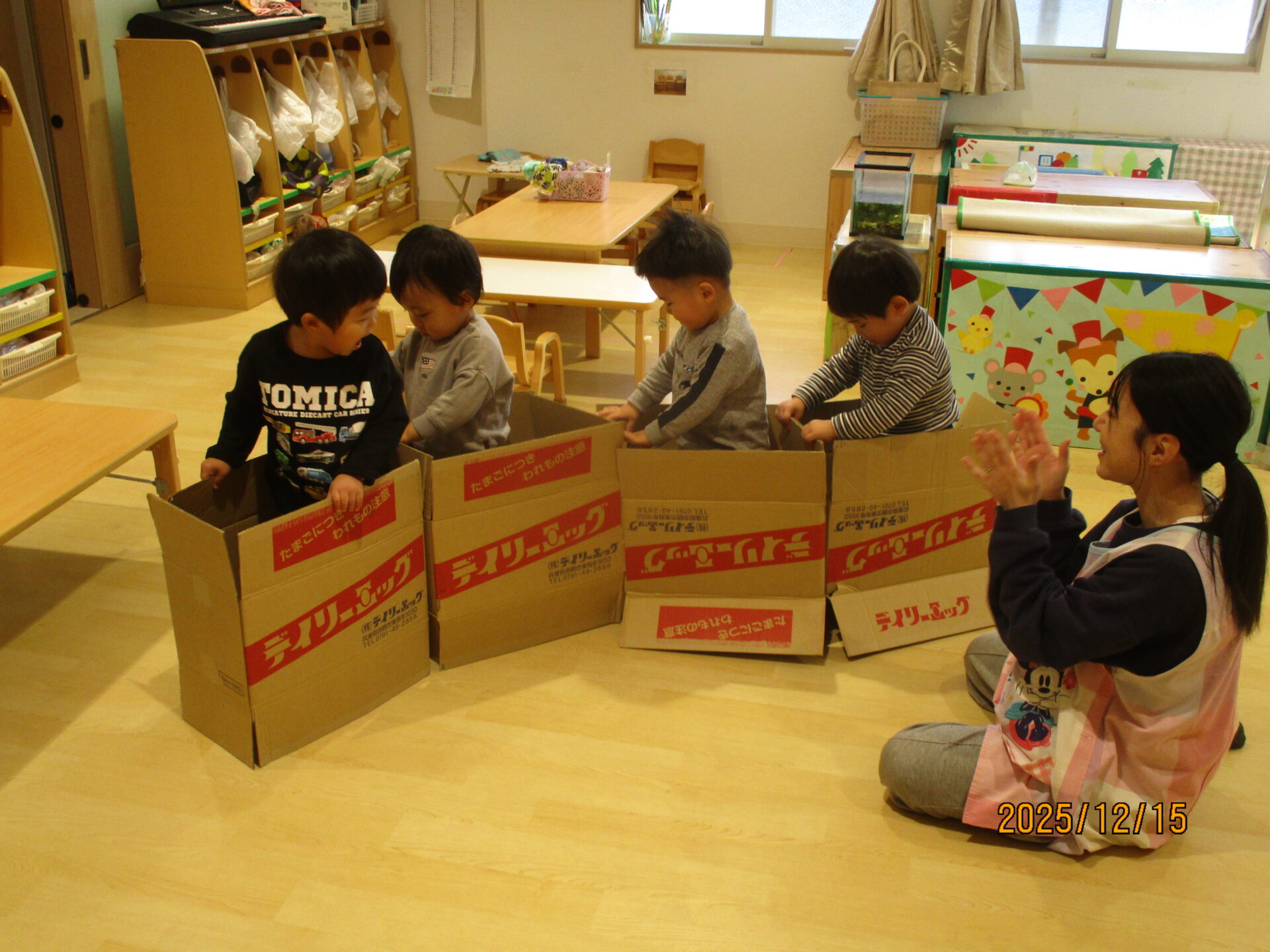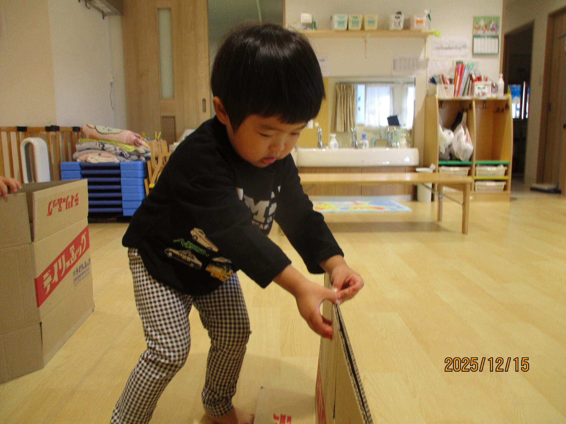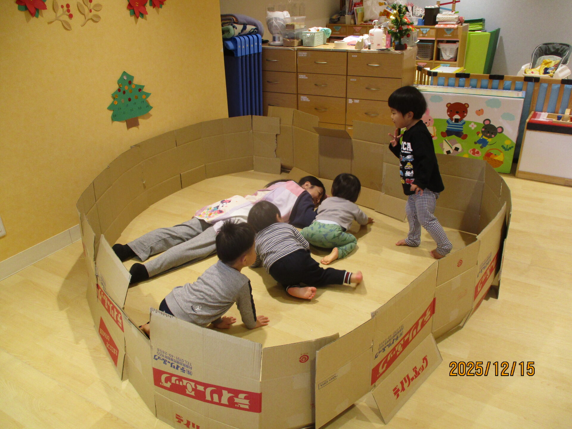 別の日には、段ボールで遊びました。