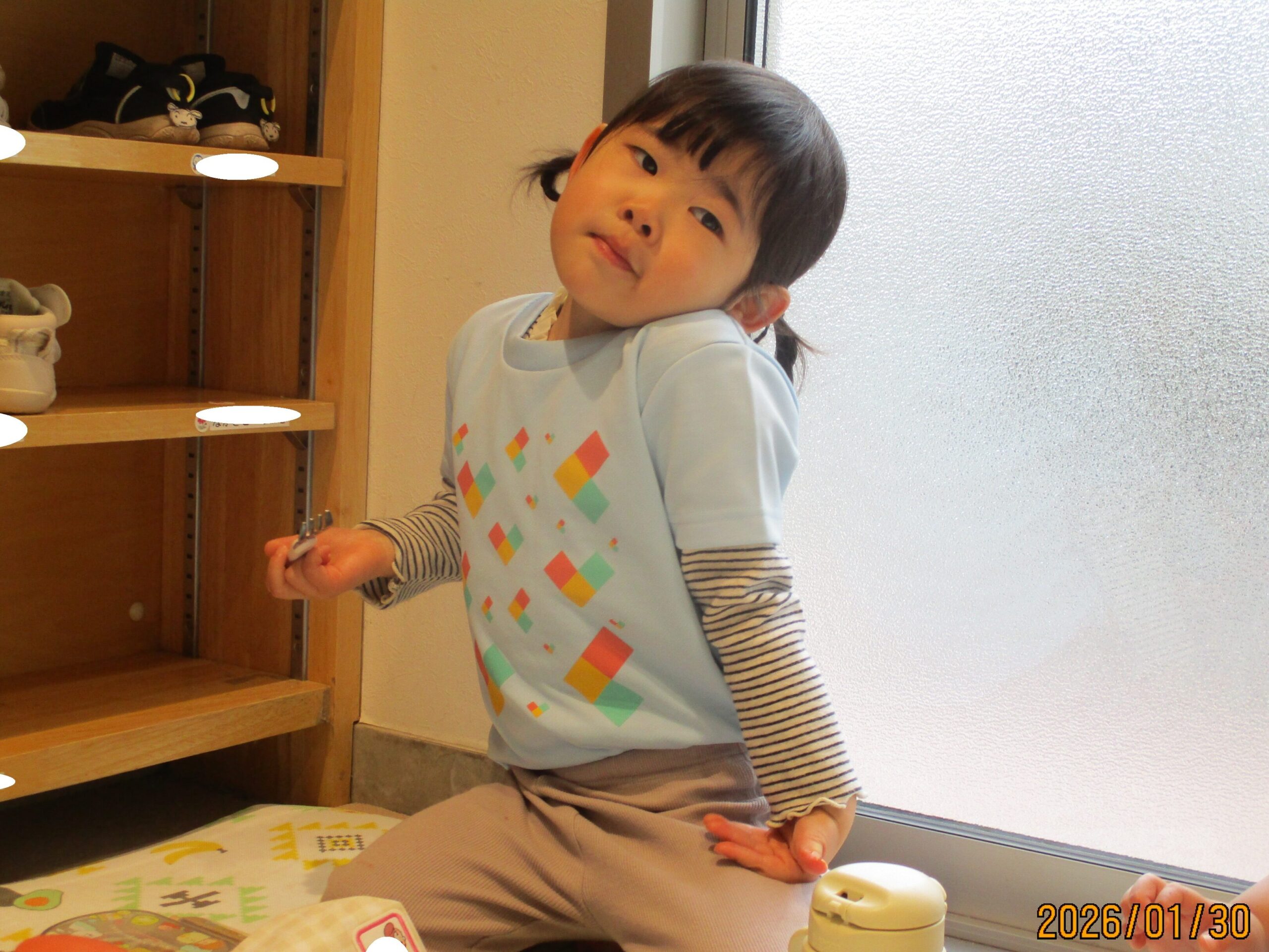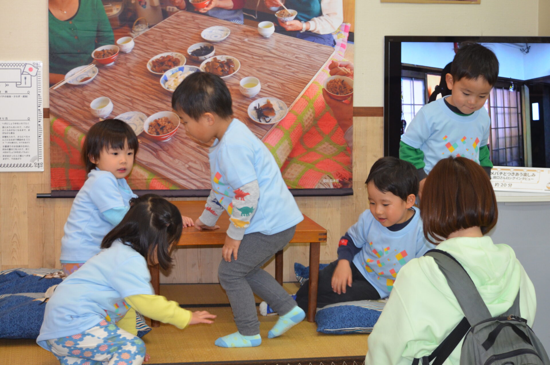 靴を脱いで畳に上がり、「そろそろごはんよ~」「あったかいお茶どうぞ💕」とおままごとが始まり、座布団の上にちょこんと正座するかわいい姿もありました🥰