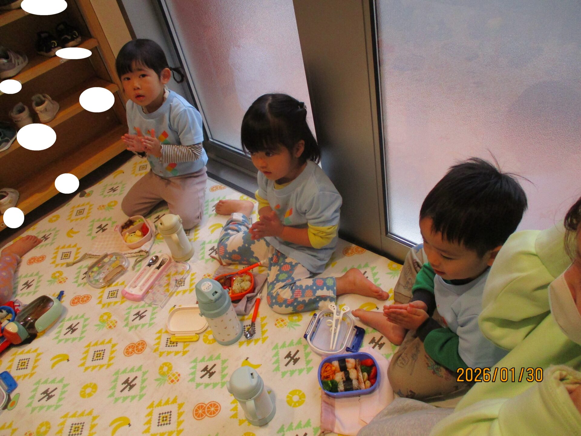 「せんせいとスパゲッティーいっしょ!」「おにぎりにおかおついてるんだ~」「お弁当(箱)かっこいいね!」とたのしくお弁当をいただく会話が写真からも聞こえてきそうです😊