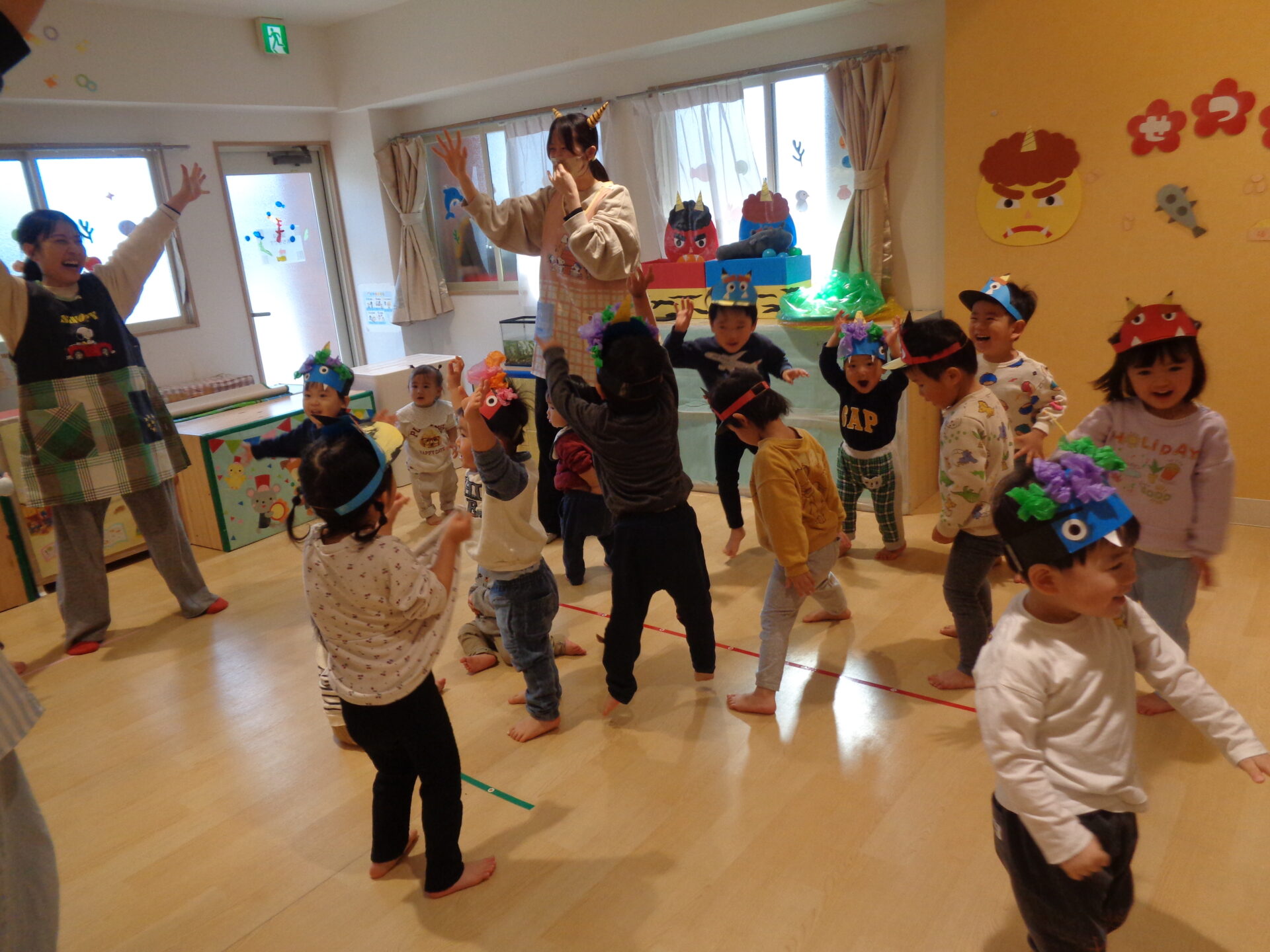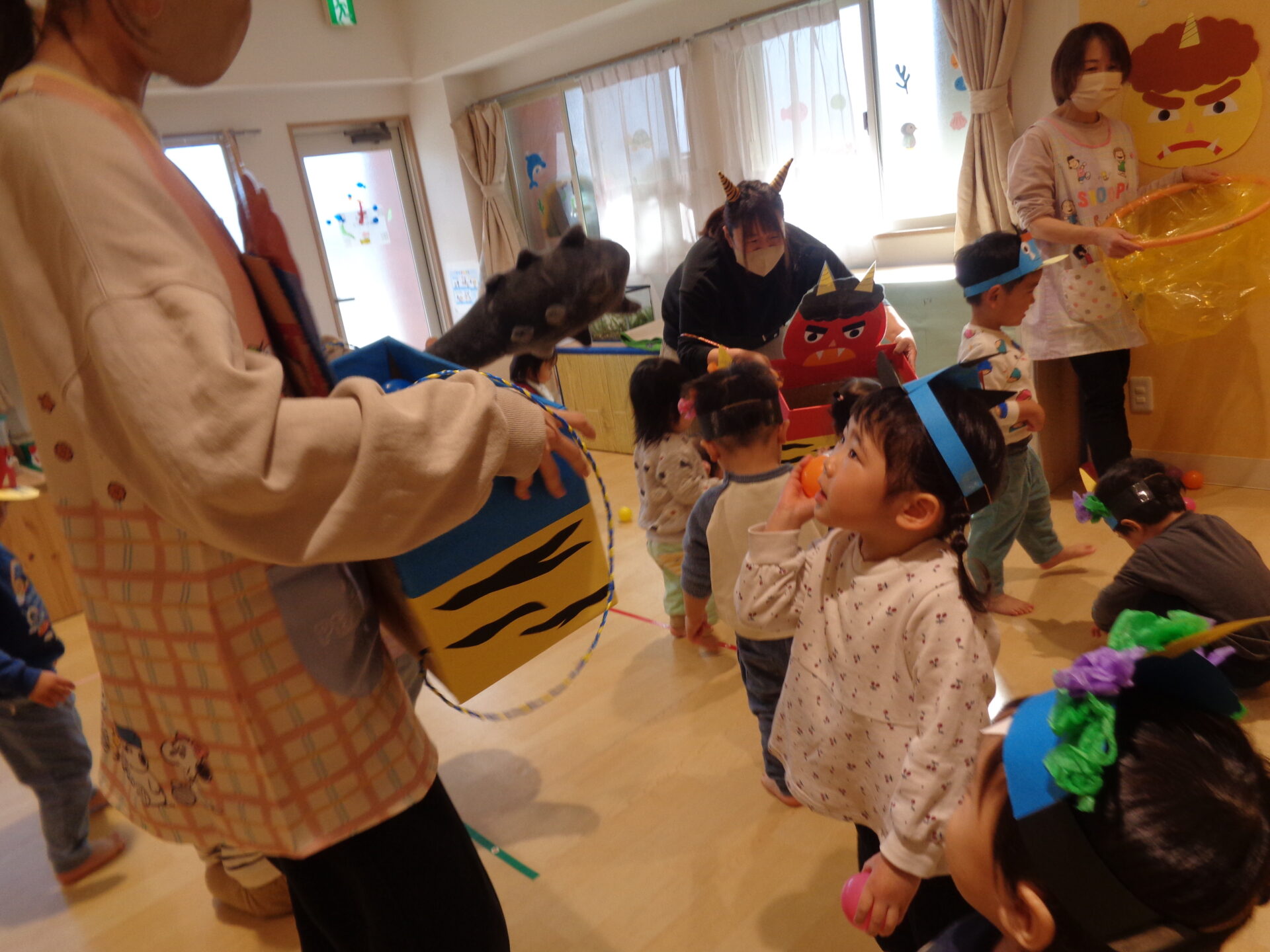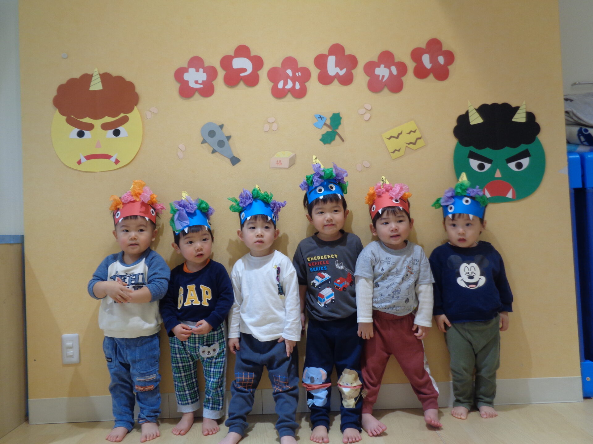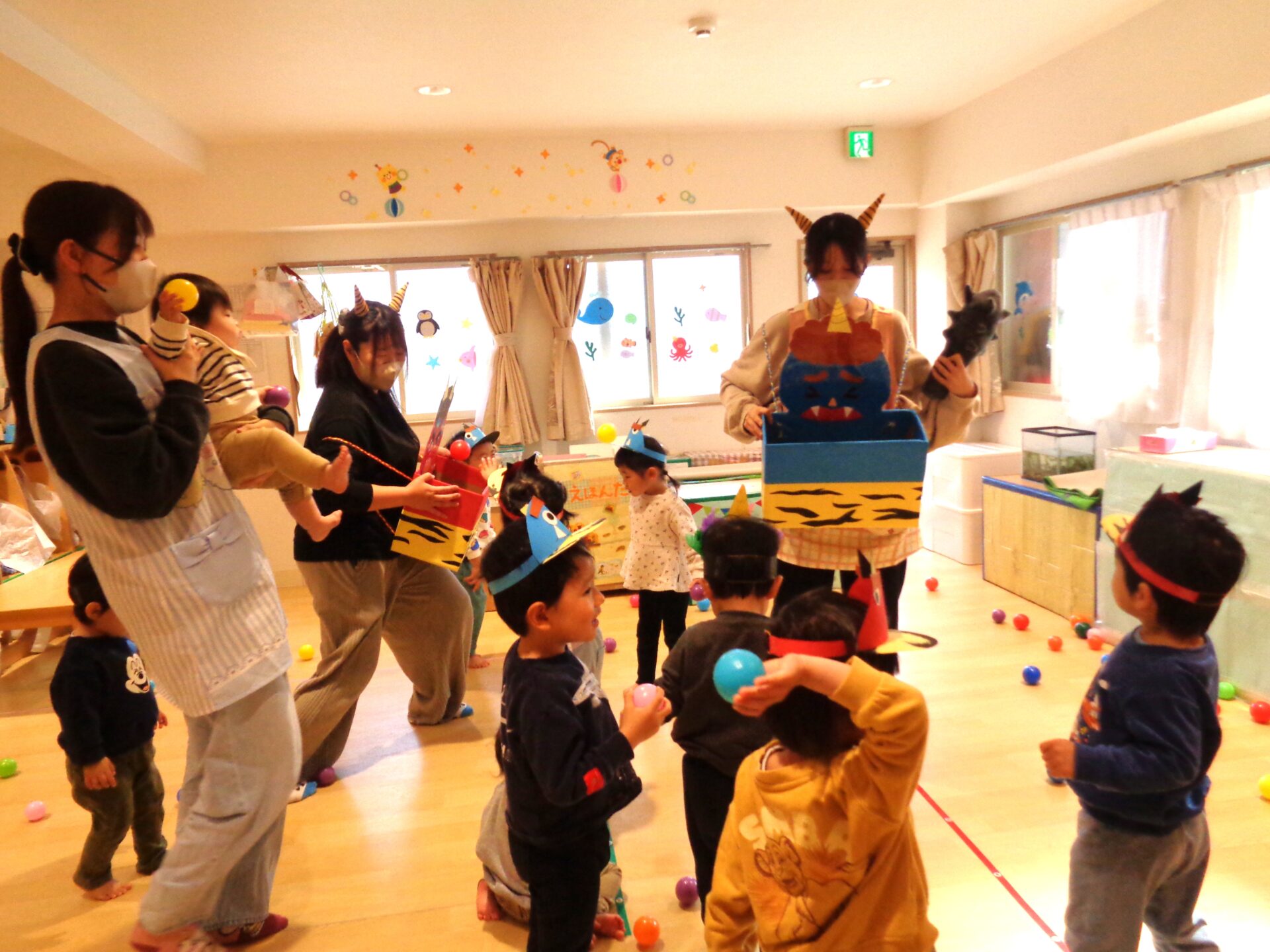 お部屋には節分の壁面が貼ってあり、室内遊びでは「おにはーそと!」と貼っている鬼に立ち向かう子ども達でした🤭