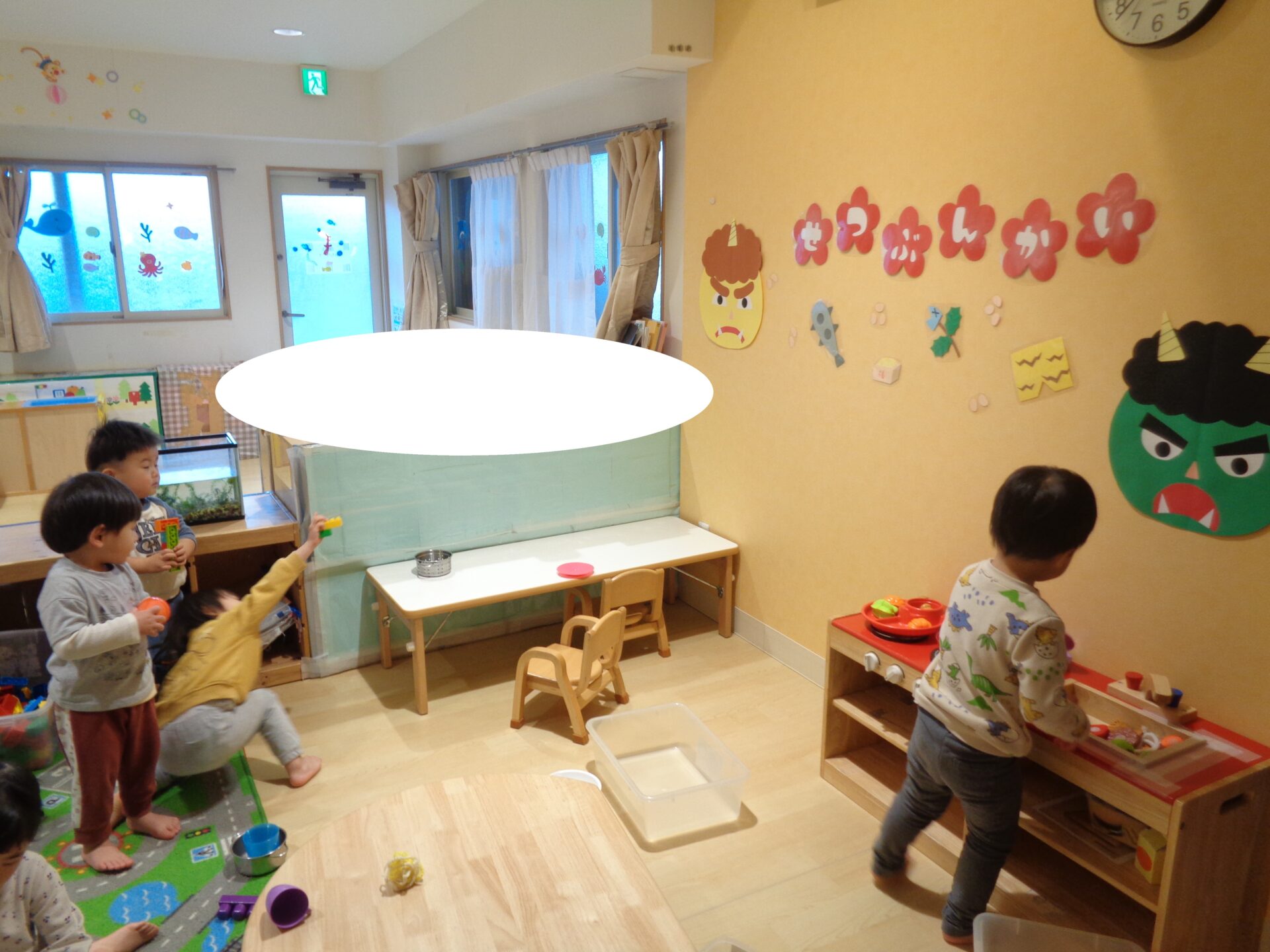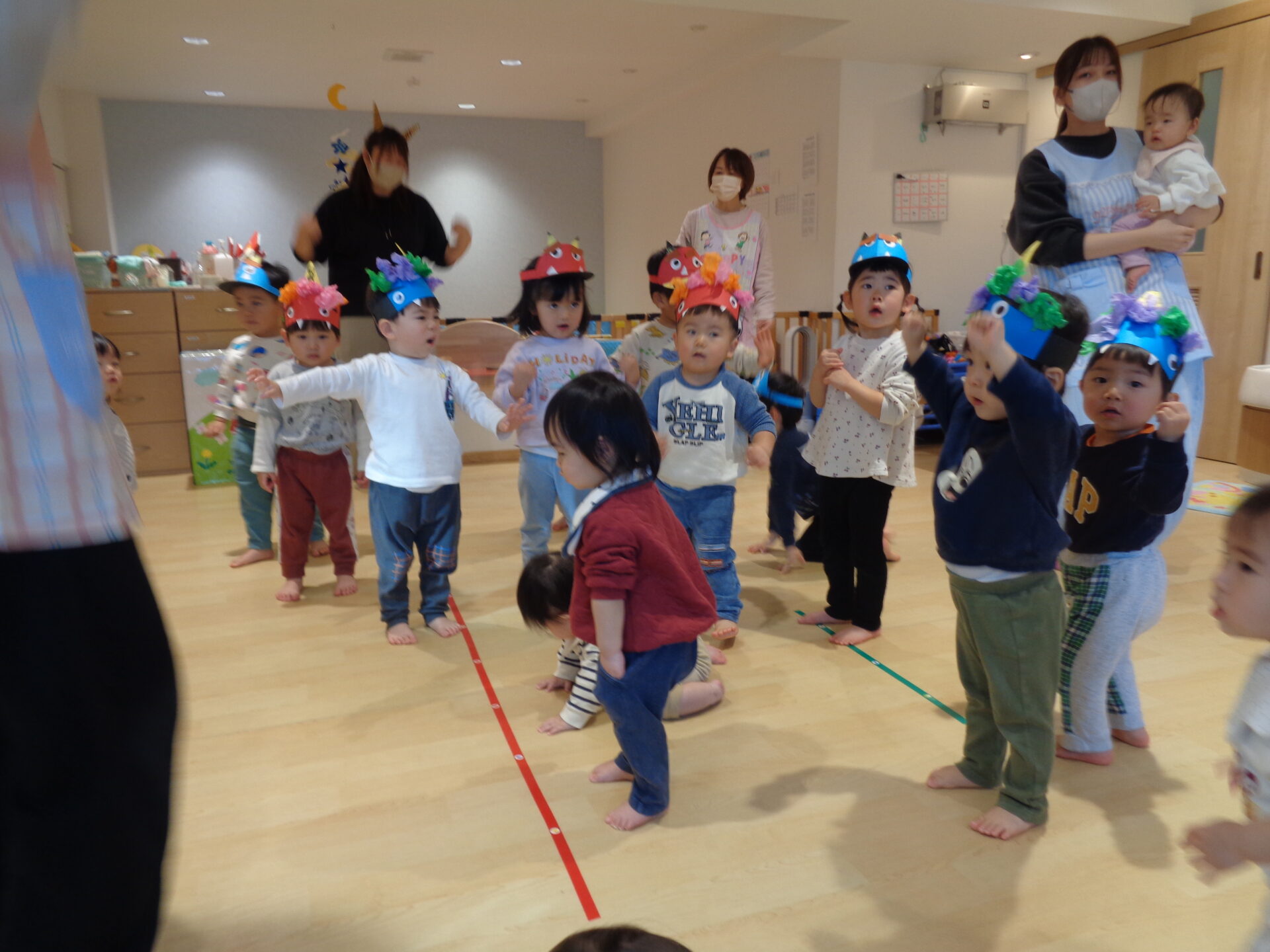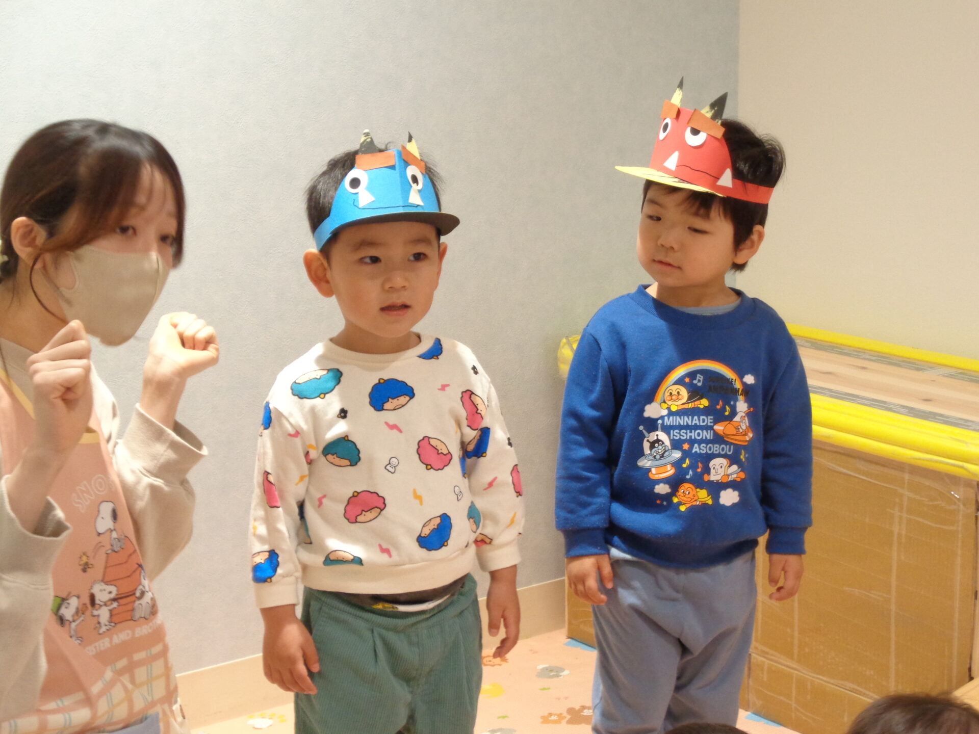 お部屋には節分の壁面が貼ってあり、室内遊びでは「おにはーそと!」と貼っている鬼に立ち向かう子ども達でした🤭