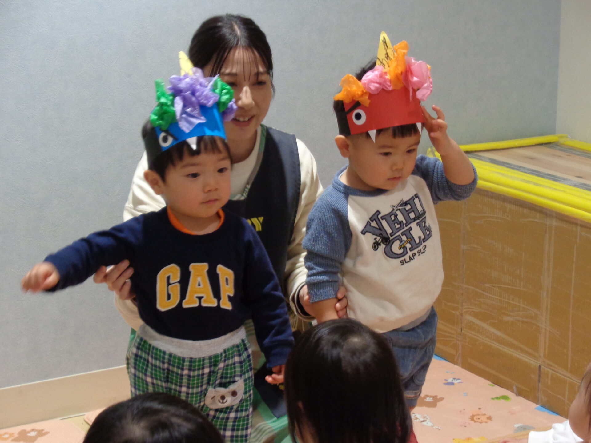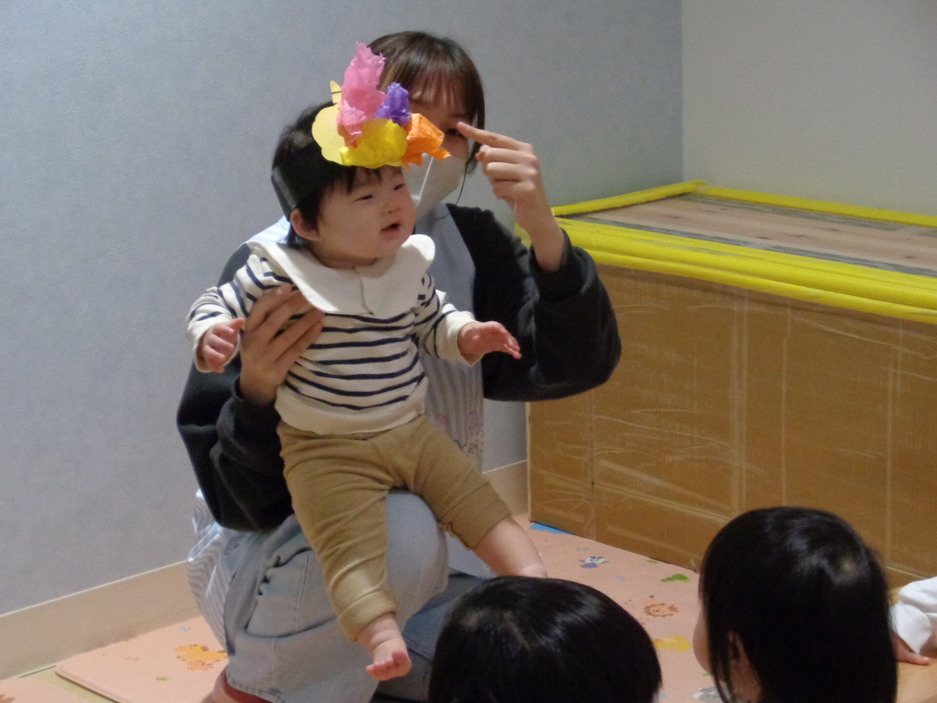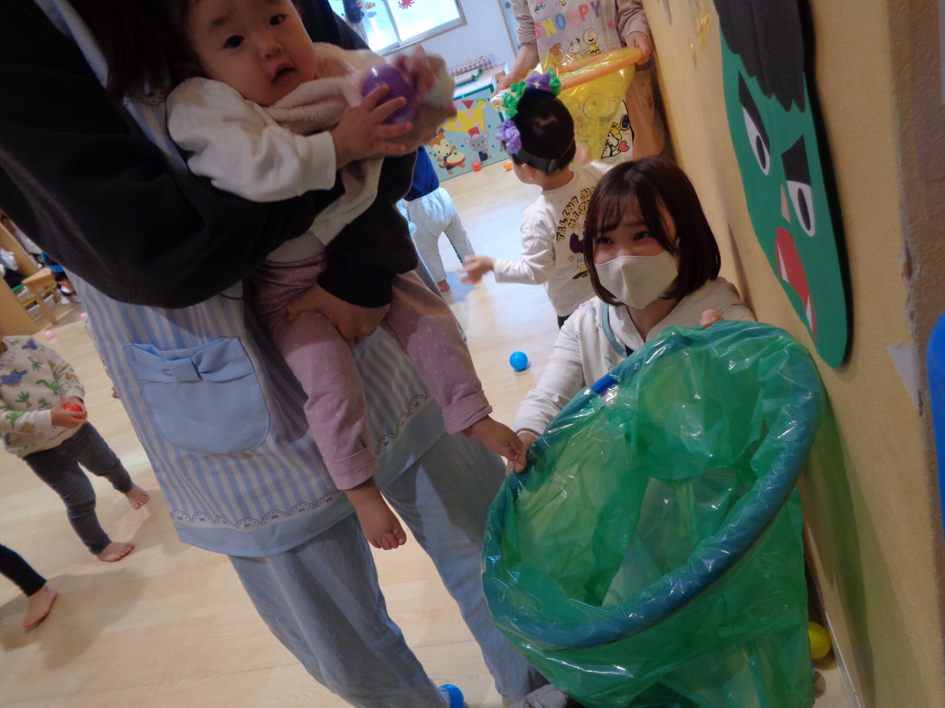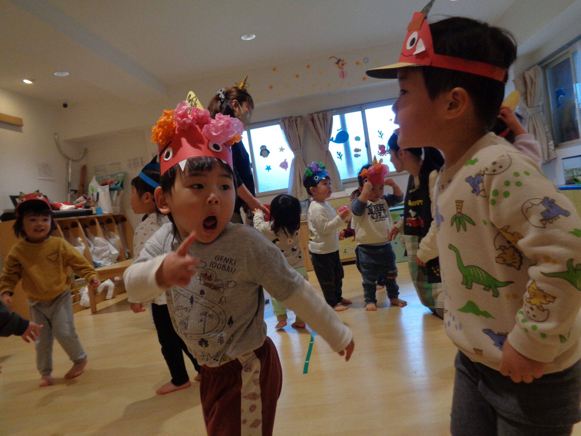 お部屋には節分の壁面が貼ってあり、室内遊びでは「おにはーそと!」と貼っている鬼に立ち向かう子ども達でした🤭