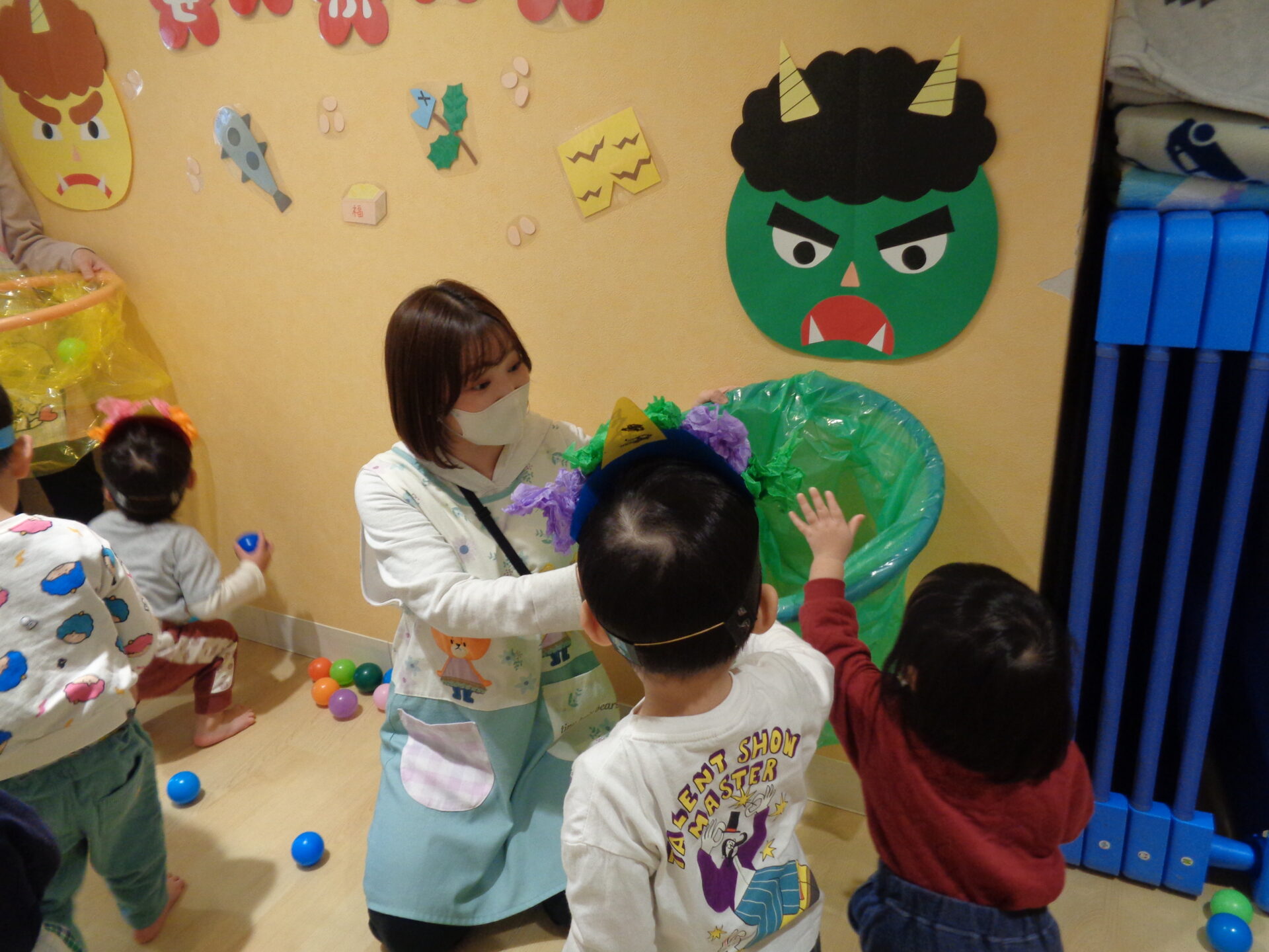 保育士が鬼に変身して、子ども達に豆を投げてもらいます。