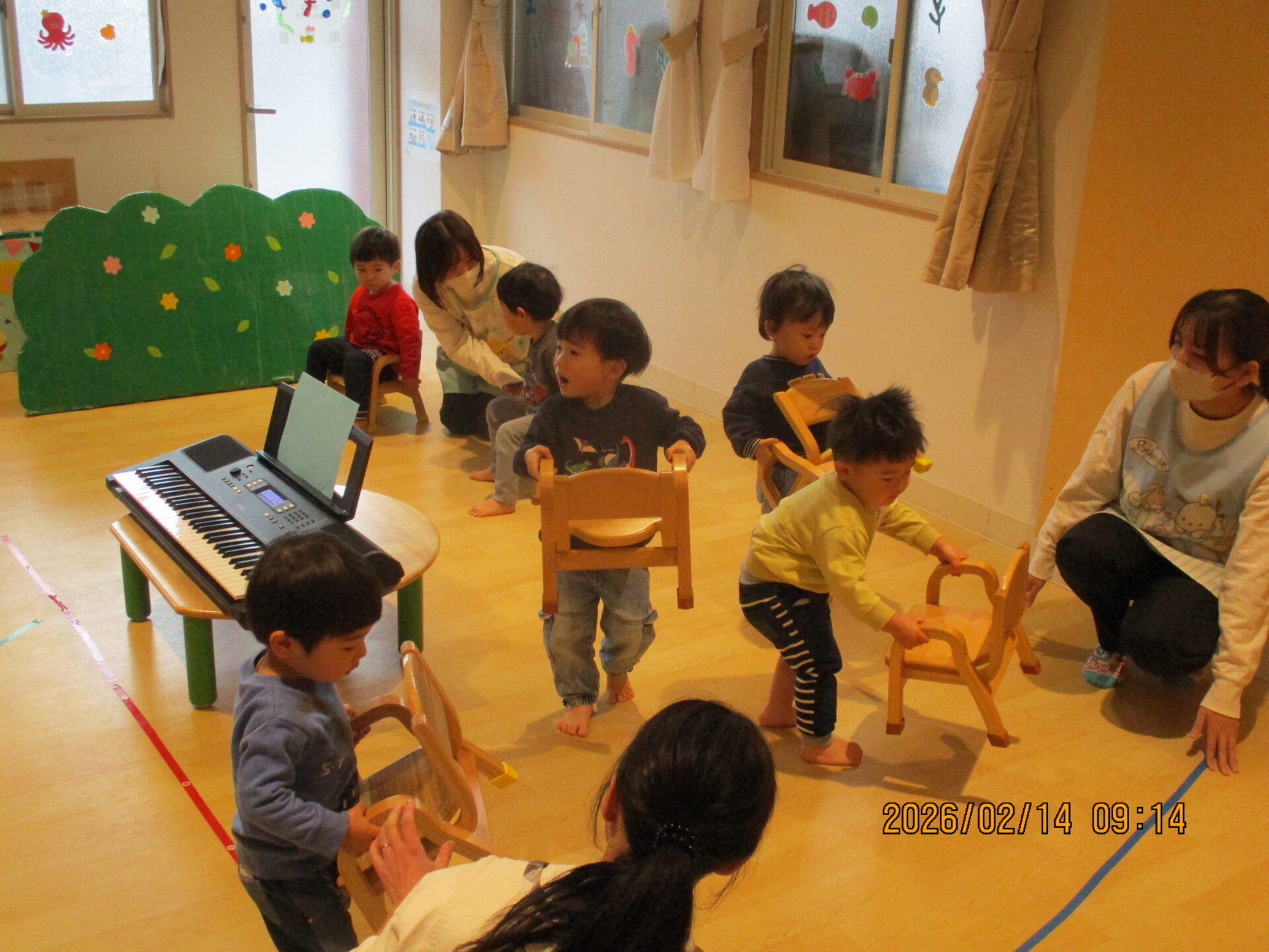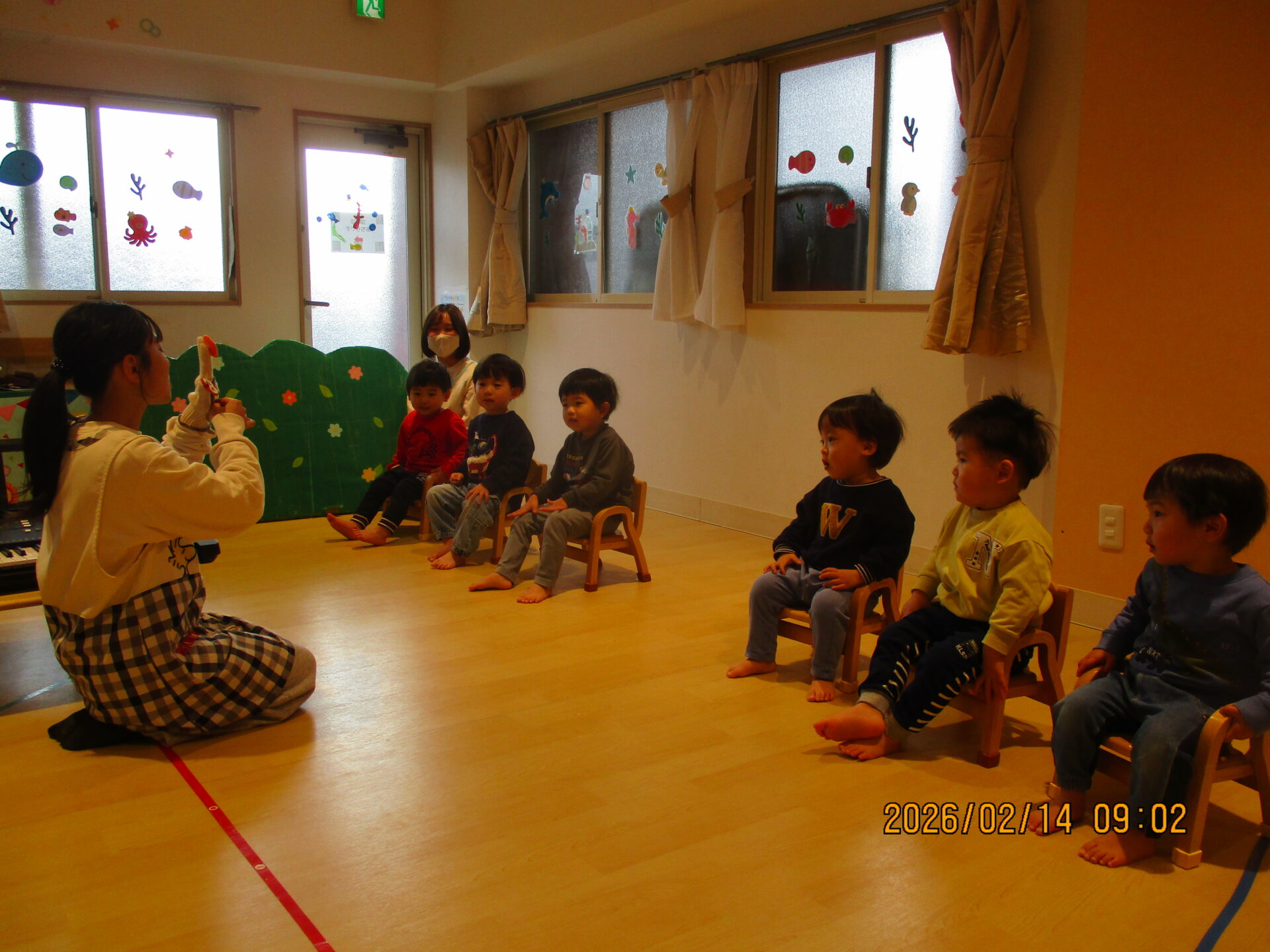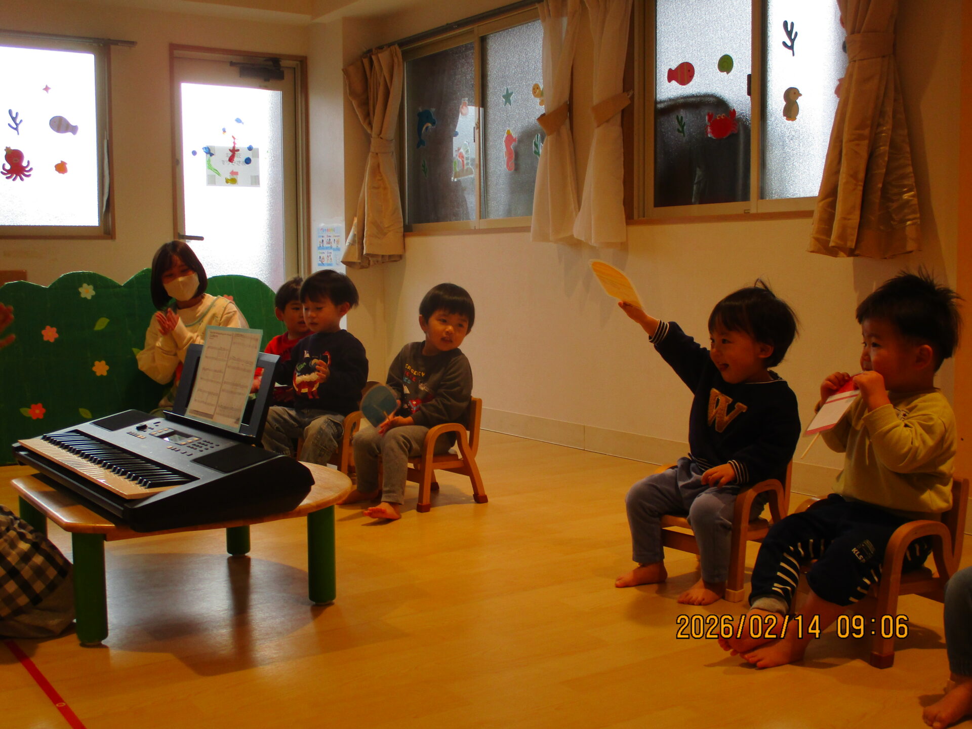 この日は自分が持っている色の歌詞の時に、元気に挙げる子もいれば、恥ずかしくて顔を背ける子、放心状態の子もいました^^
