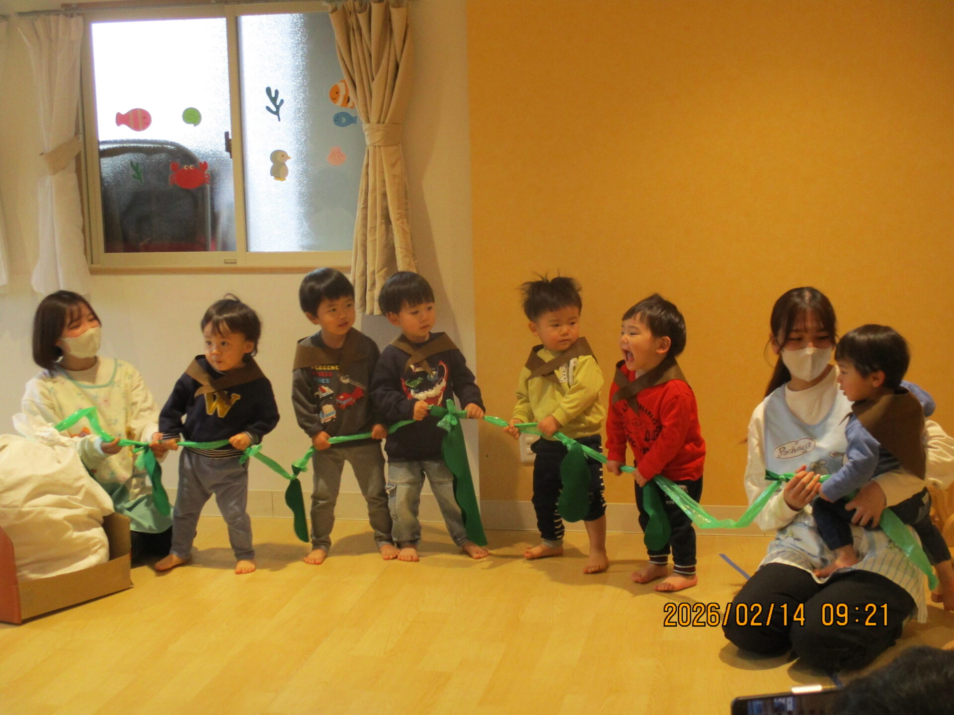 一カ月前に絵本を読み、それから「よーいしょよいしょ」の歌に合わせて引っ張りあそびをしてきました。