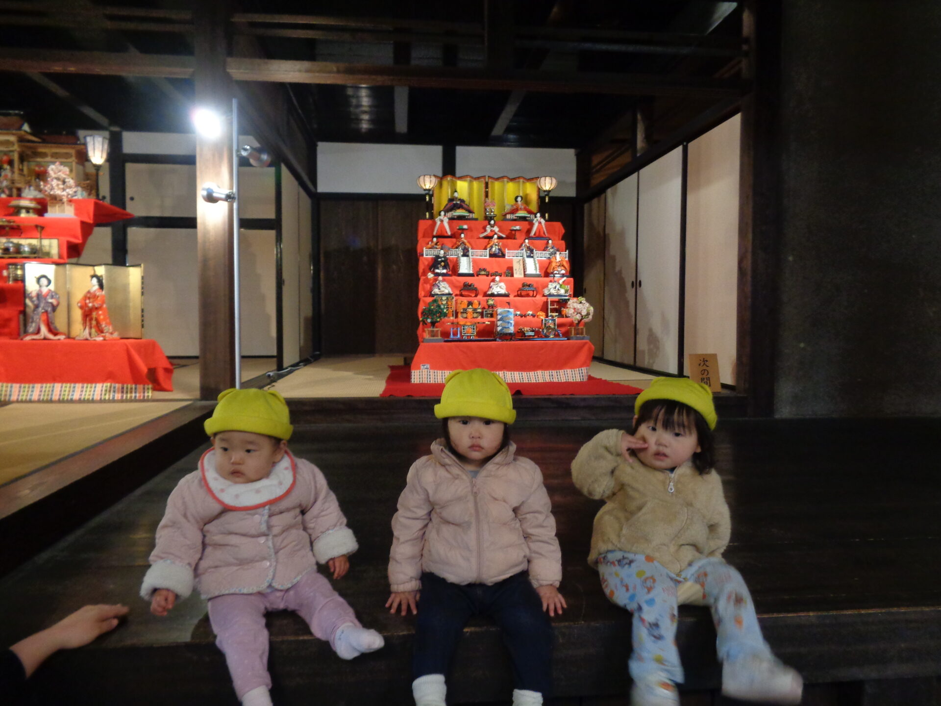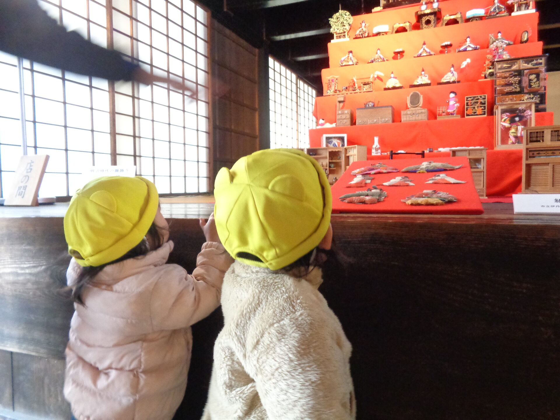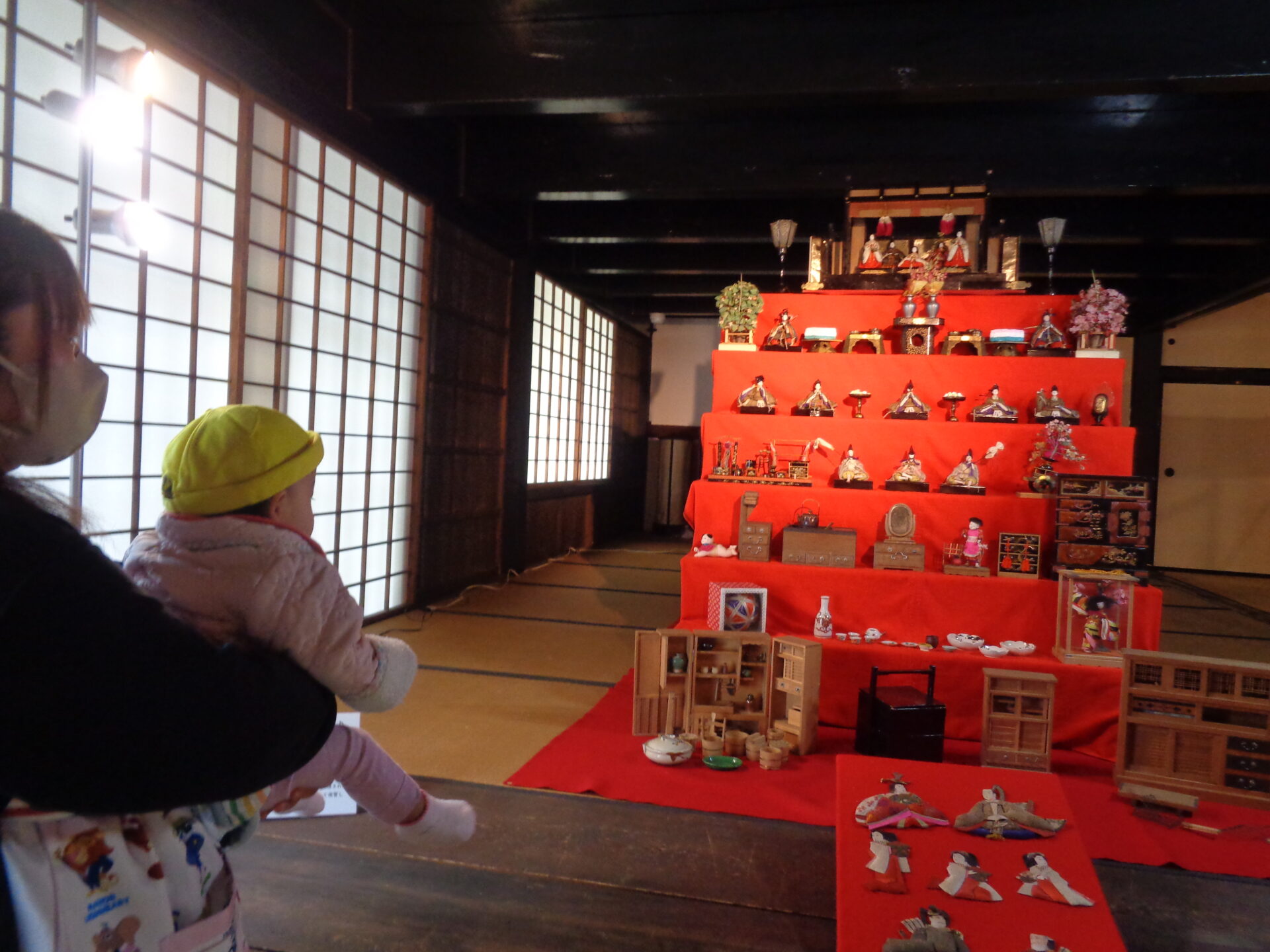 実際見に行くと少し薄暗い場所かつ大きなひな人形に驚く表情の子ども達。。。