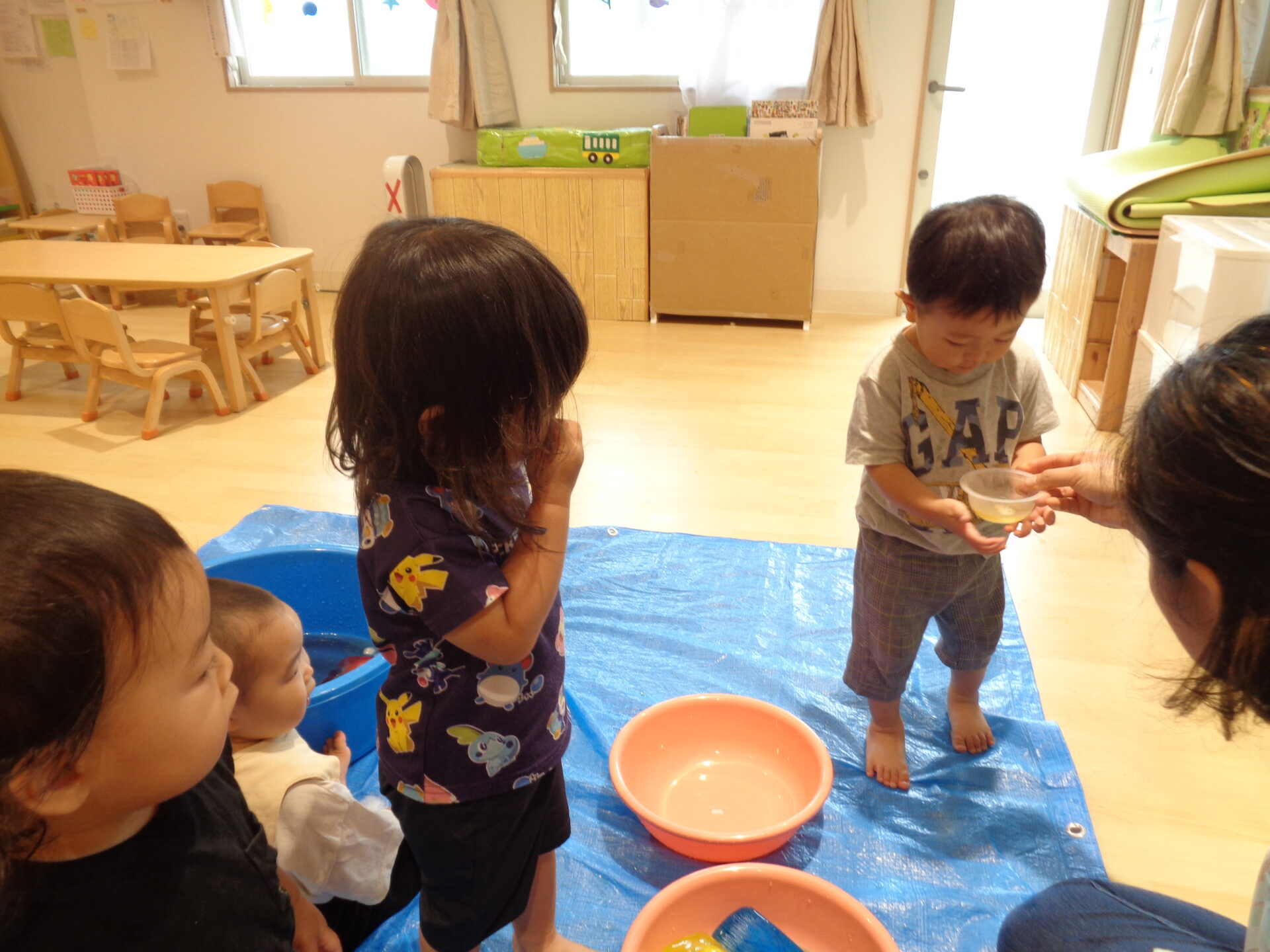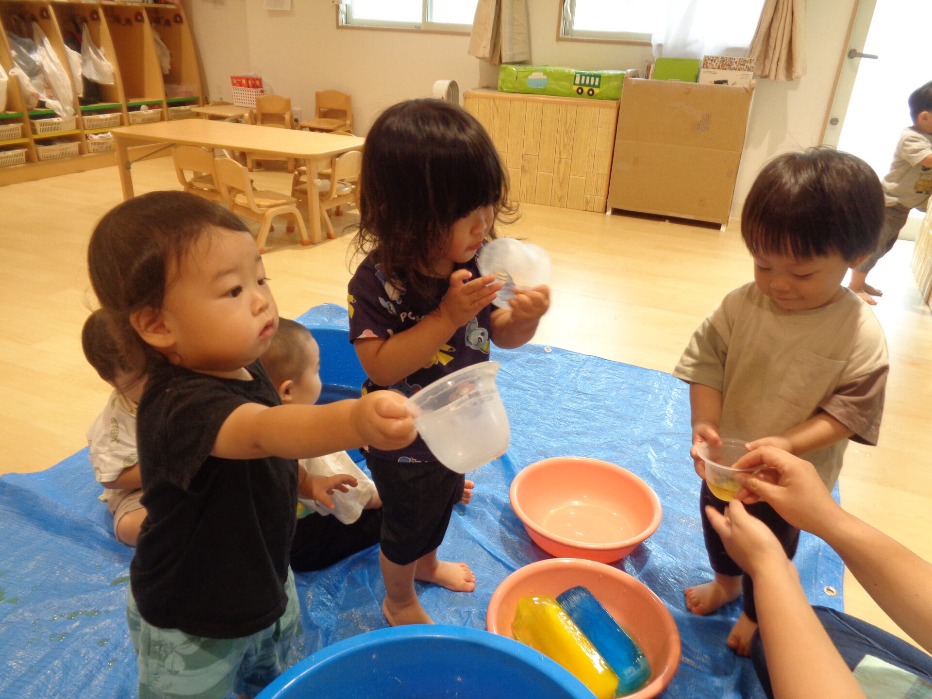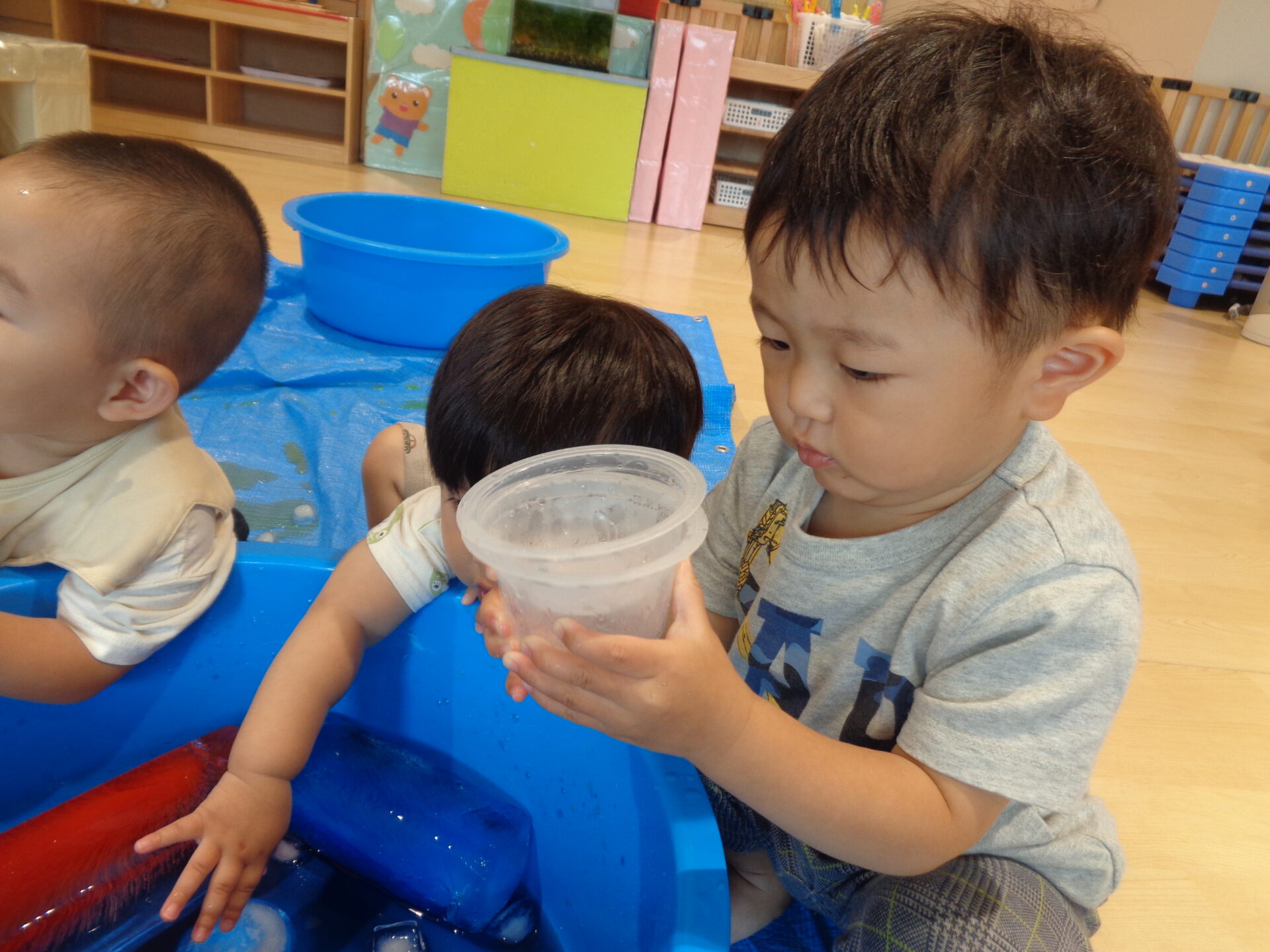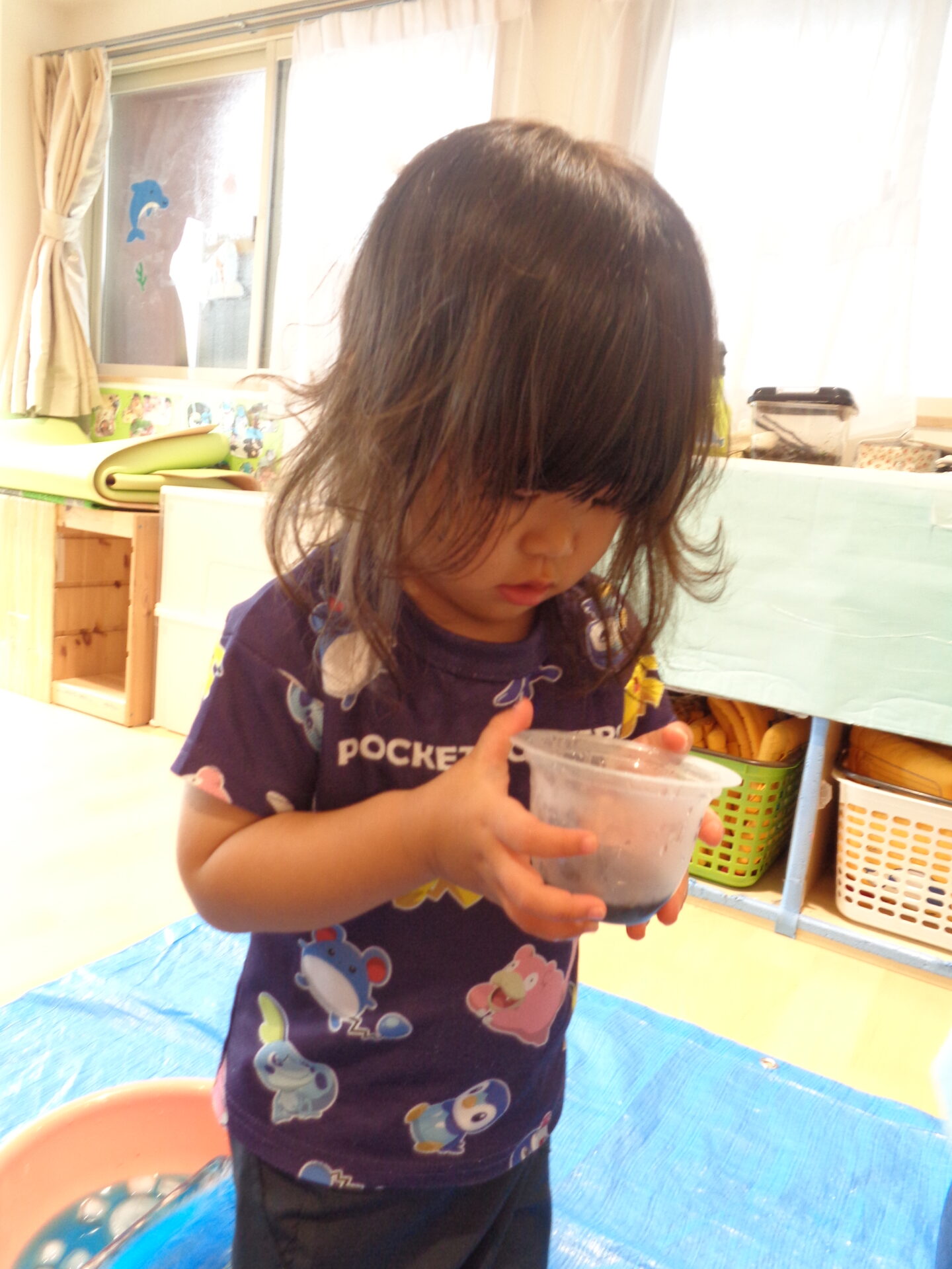 色水をカップですくって、別の容器へ移すことを楽しんでいました。