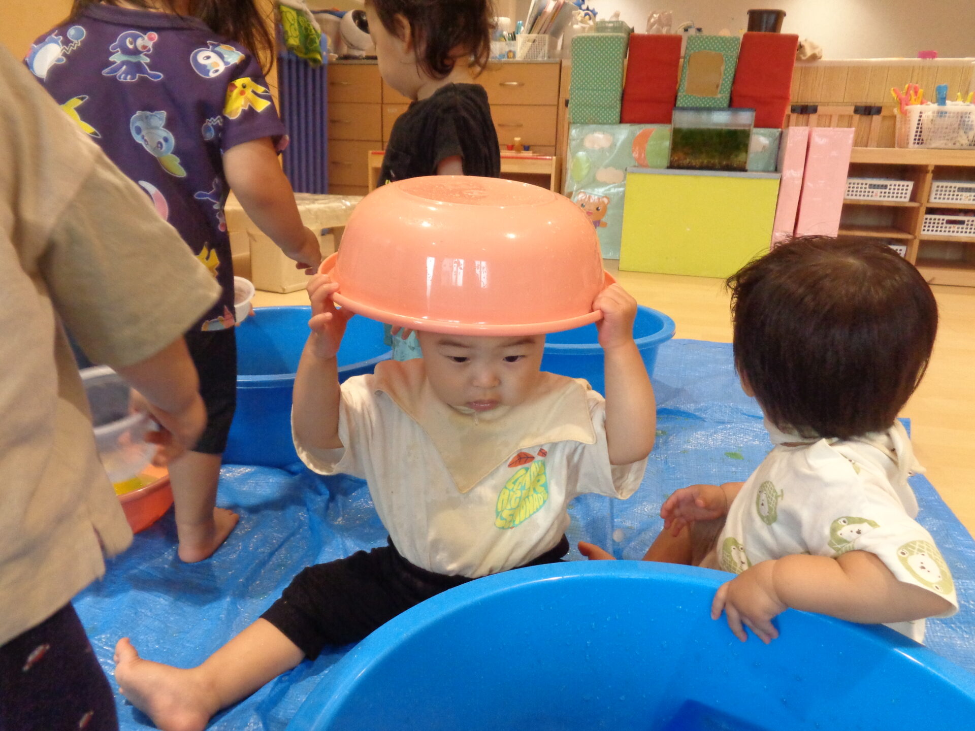 洗面器が帽子に見えたのか、上手に被っていました^^