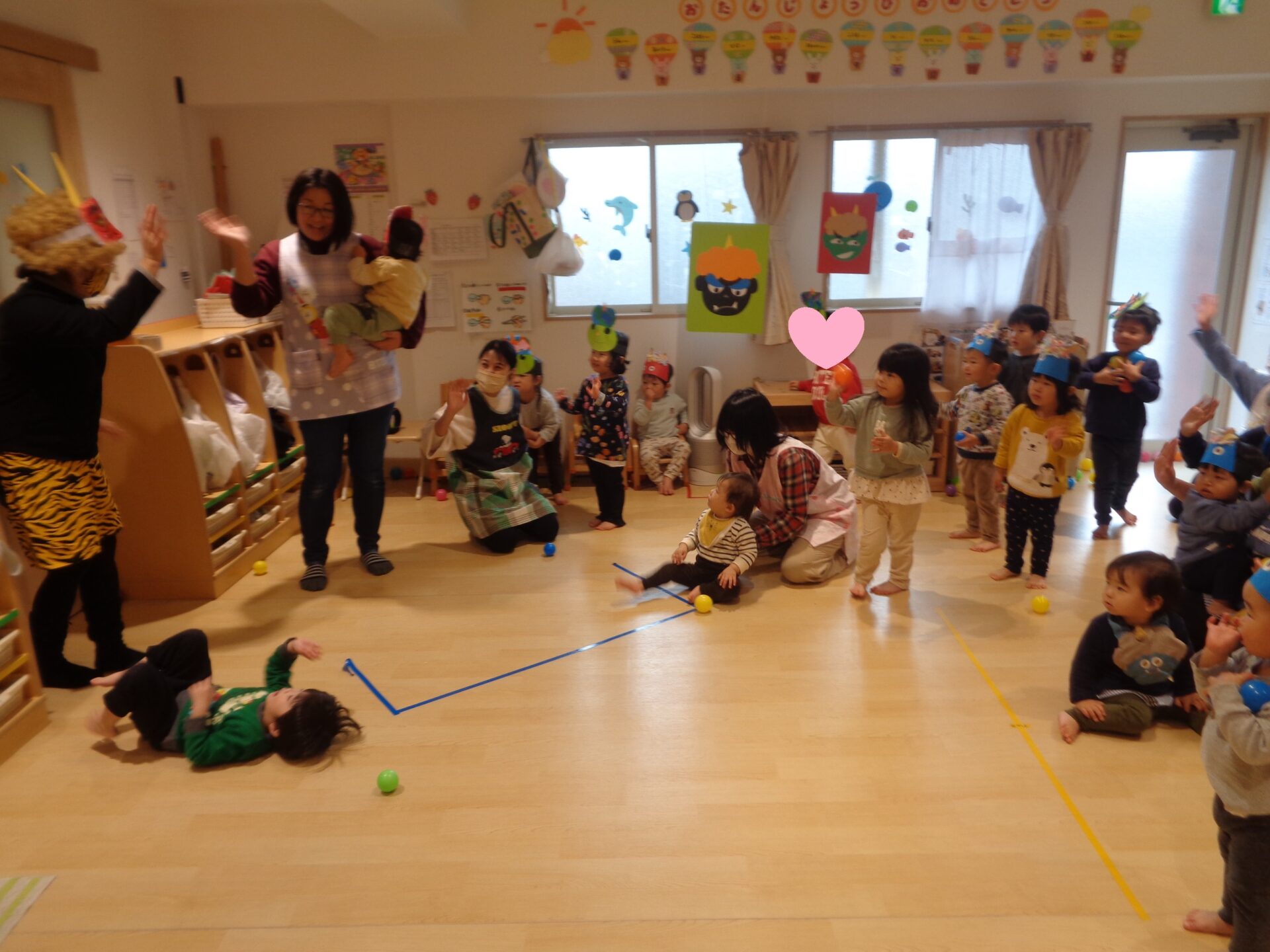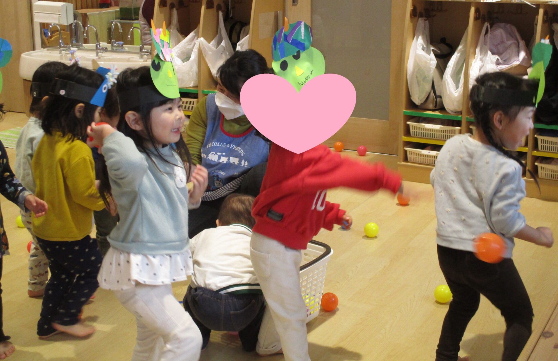 目を丸くして驚く子ども達、「鬼は外ー!」とボールを投げる私たちでしたが・・・