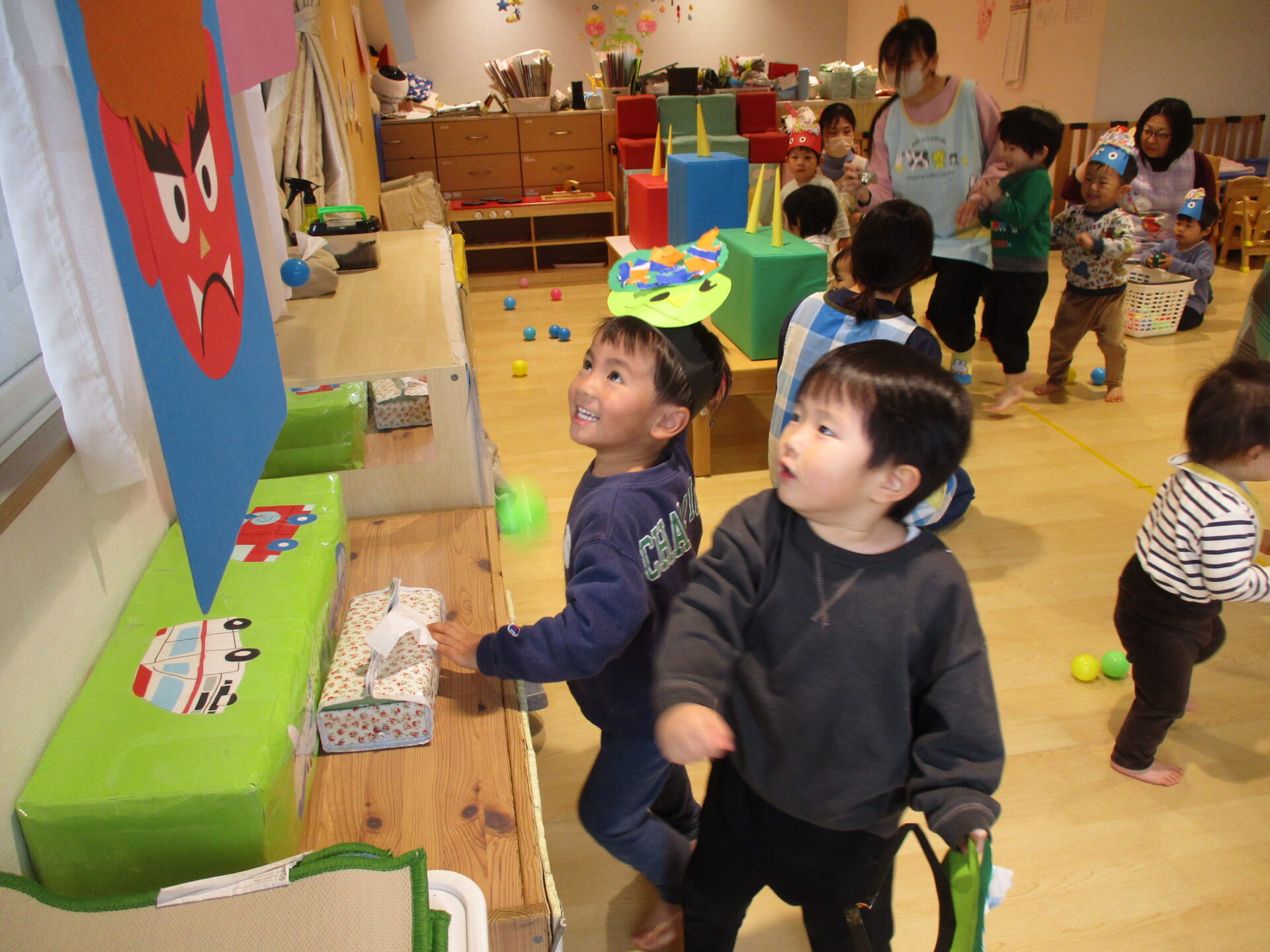 あめ組さんの投球は力強く、夢中になるとダイレクトに鬼にダメージを与えに行く子もいました😅