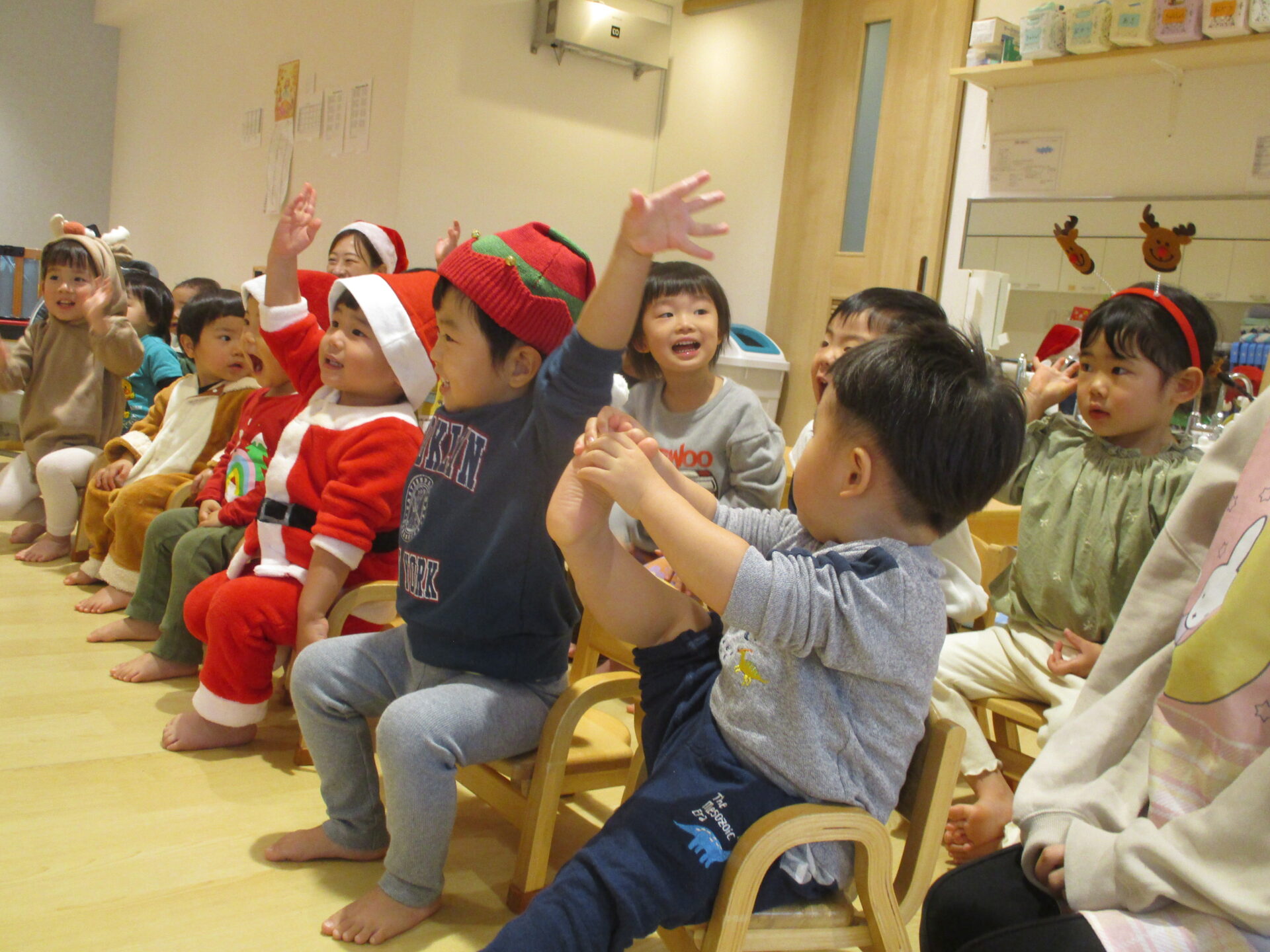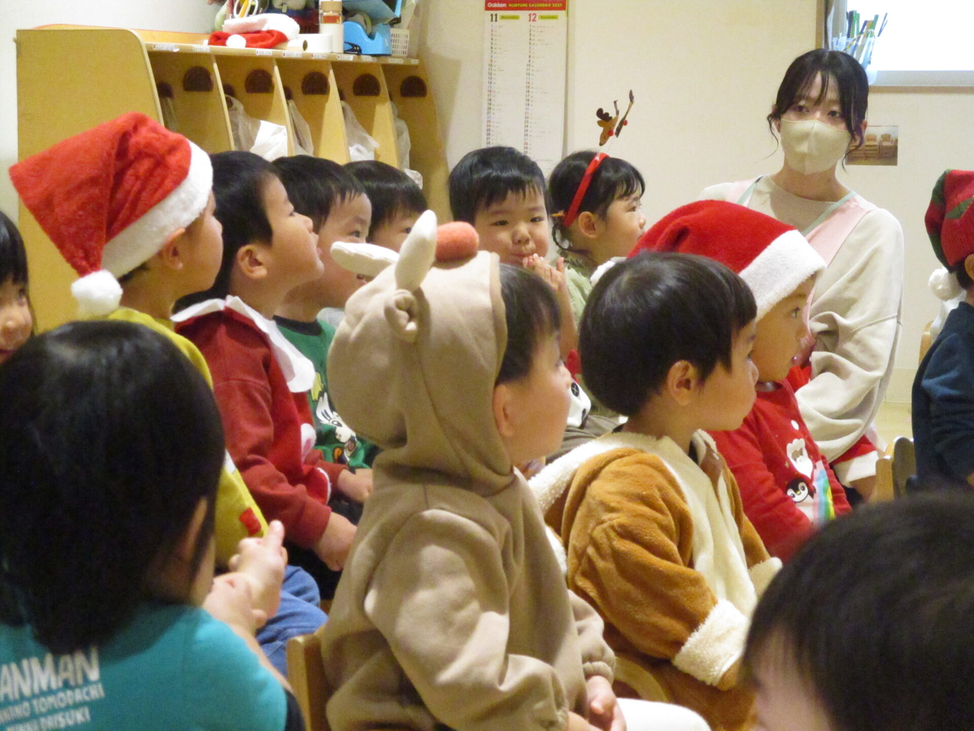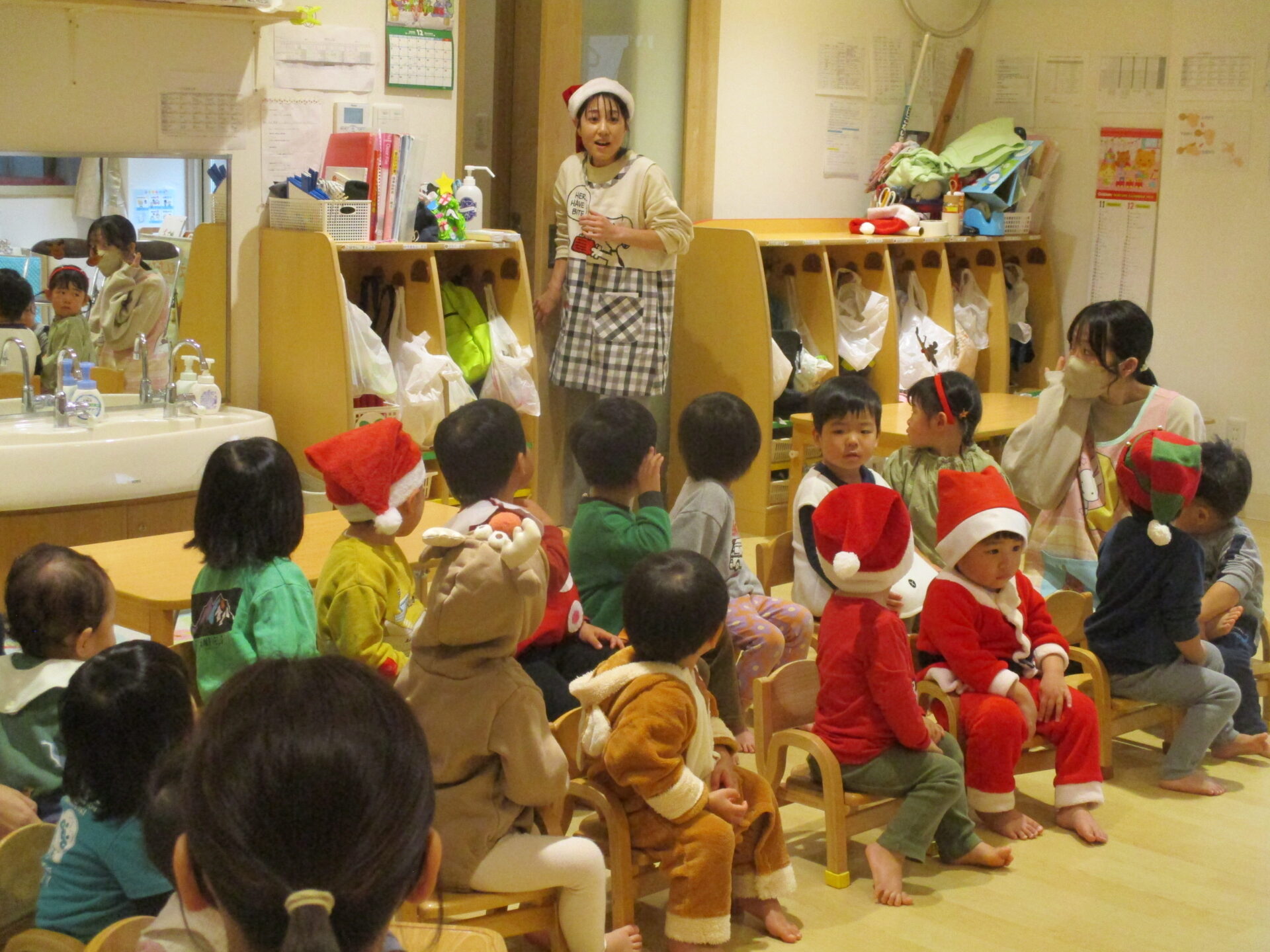 あわてんぼうのサンタクロースがパジャマで登場するとみんなから「ちがう~」の声が聞こえたり、お話をよく聞いて参加してくれていました🎅
