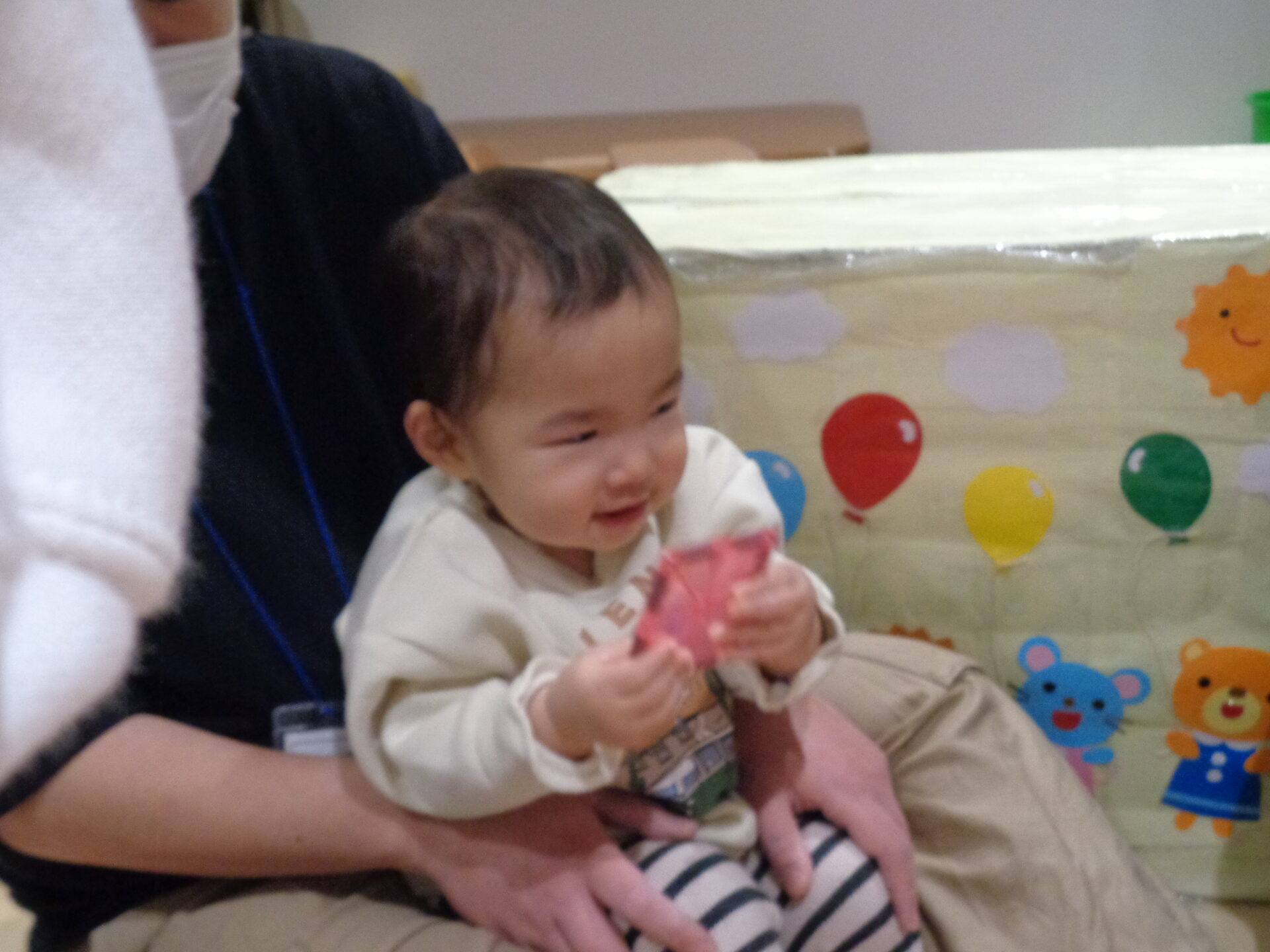 振って音を楽しんだり、シールを剥がそうとしたりと、様々な様子で参加してくれました。