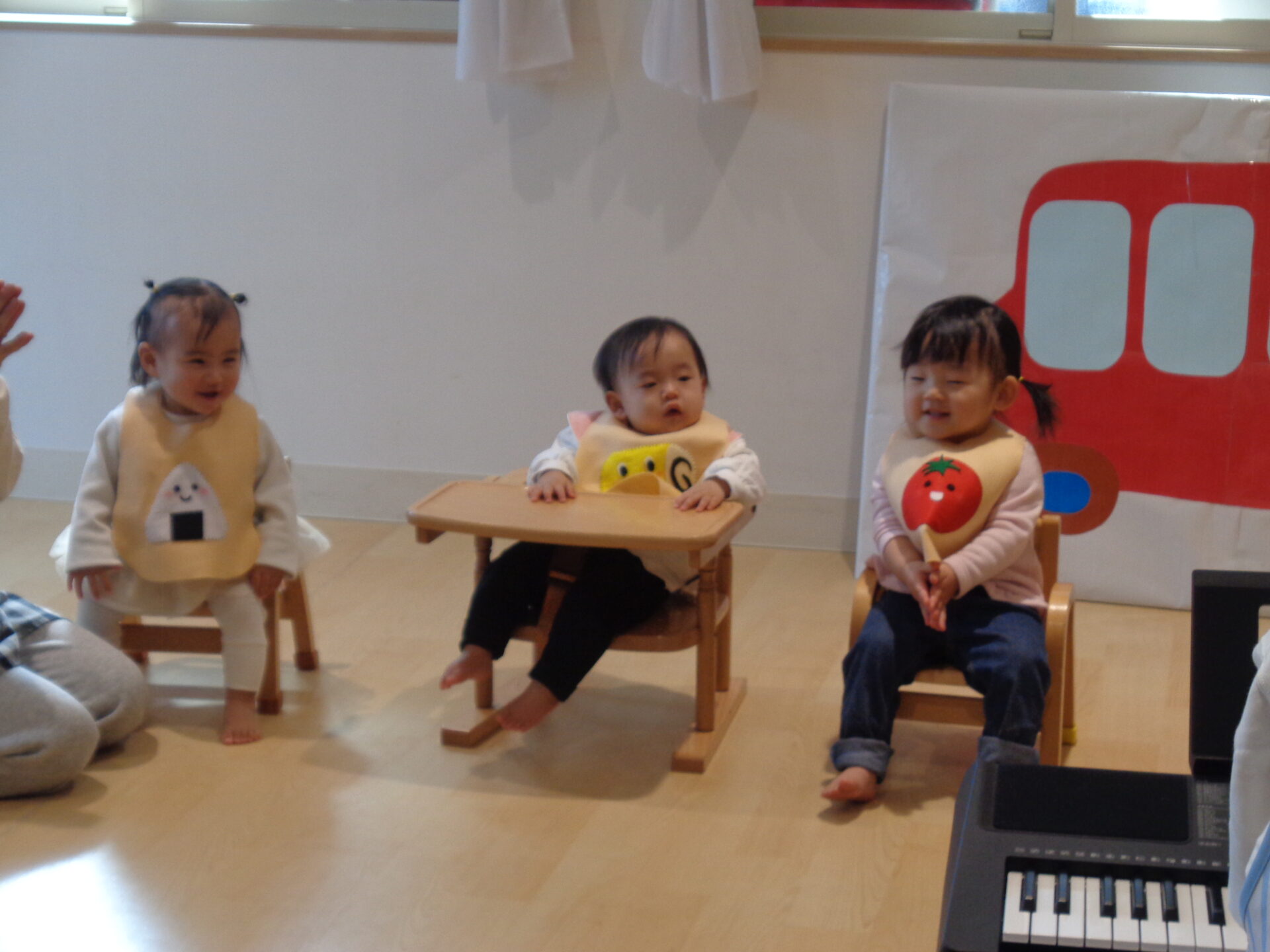 うみ組みんなで可愛い食べ物に変身しておべんとうバスでお話遊びをしました。